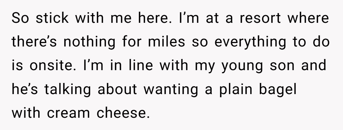 You’re on vacation. It’s a chill morning. Your kid’s one request? A plain bagel. You spot the last one sitting pretty in the deli case—victory! Or so you thought. One Redditor recently found themselves in an unexpected breakfast battle at a resort when a staff member claimed that last plain bagel as her own. No label, no sign—just a verbal “it’s mine.” The kicker? A manager backed her up, swiping the bagel away before the parent’s stunned eyes.