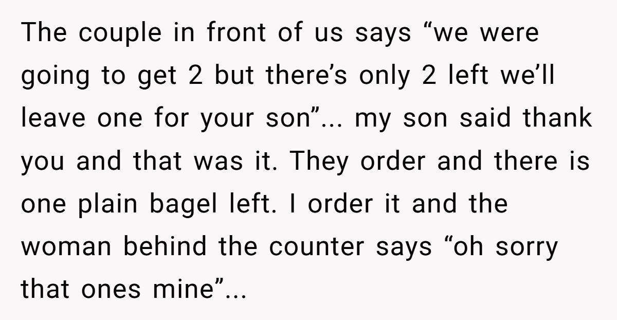 Was the Redditor wrong for asking about the bagel? Not at all. Their son wanted a plain bagel, there was one in sight, and no signs said otherwise. The staffer’s claim and the manager’s backup turned a minor moment into a major misstep.