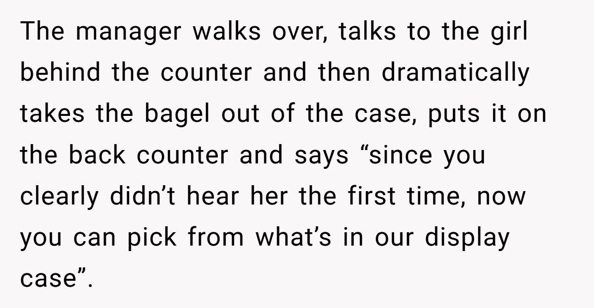 Confused, the Redditor hesitated, thinking maybe she was joking. But she wasn’t. A couple ahead of them in line, seeing what was happening, even offered to pass on the bagel so the child could have it. Still, the staff member stood her ground—and just to drive the point home, the manager appeared and physically moved the bagel out of the display case. It was never marked as unavailable or pre-ordered. It was just…claimed.
