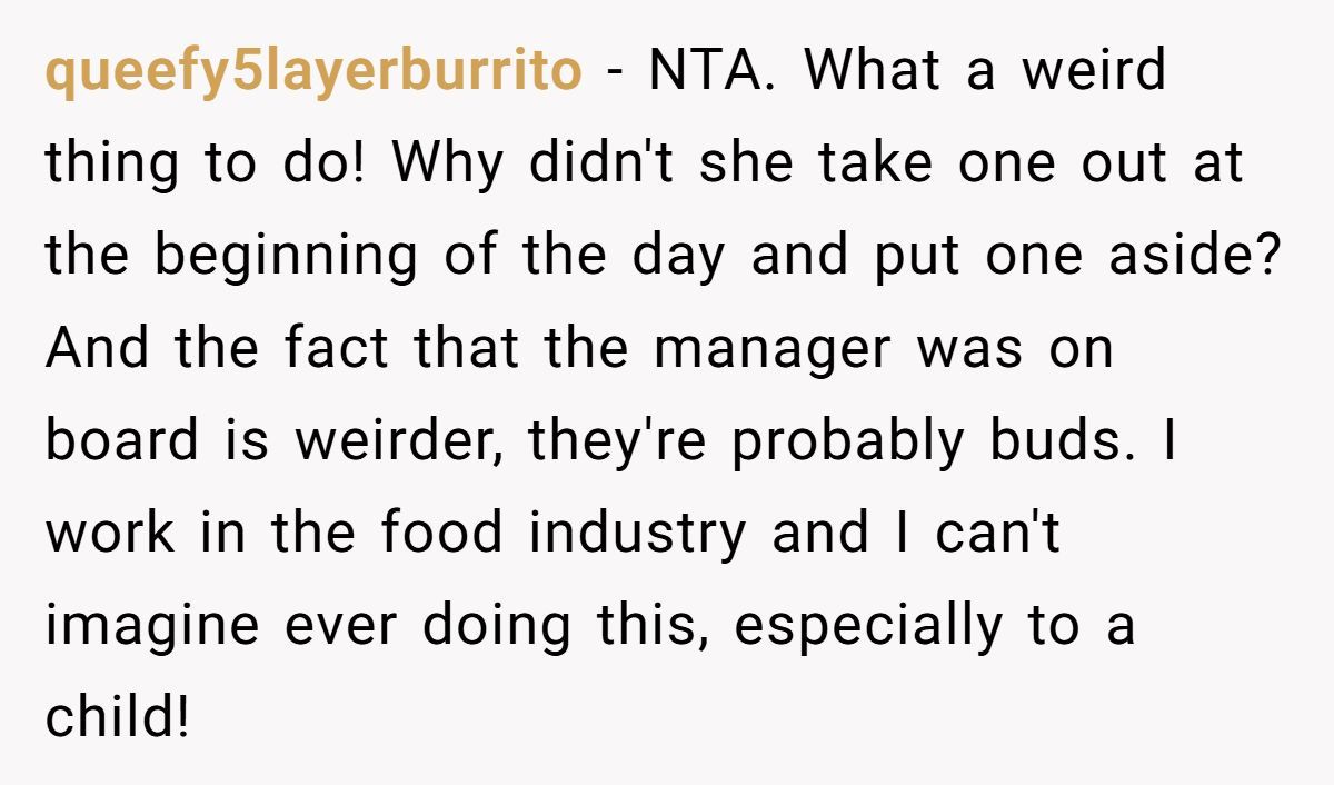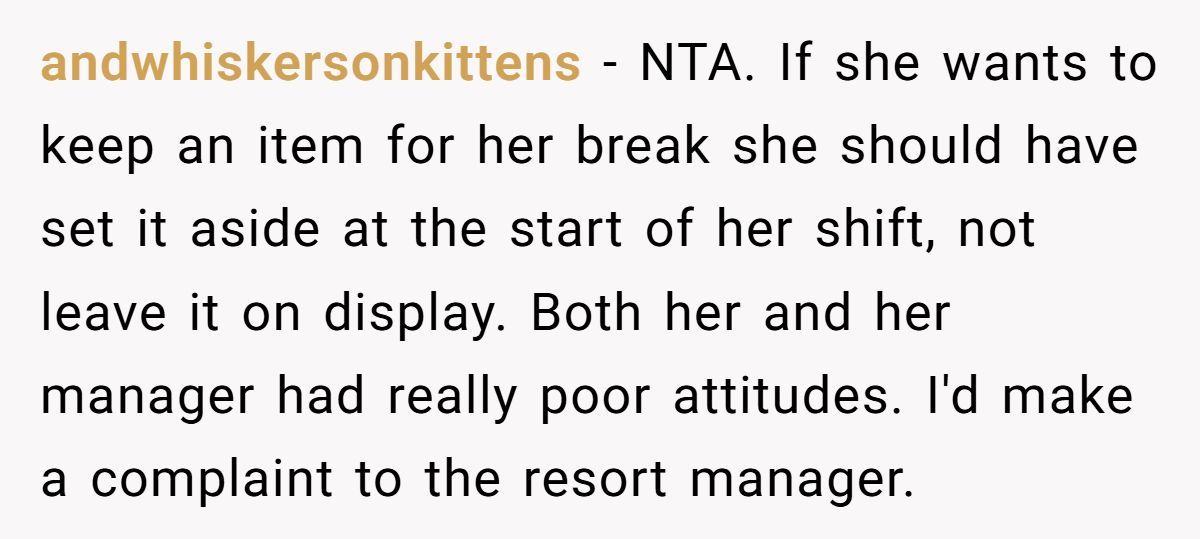 Meanwhile, many redditors also agreed the employee was out of line—staff shouldn’t claim food meant for customers, and management should’ve handled it better.