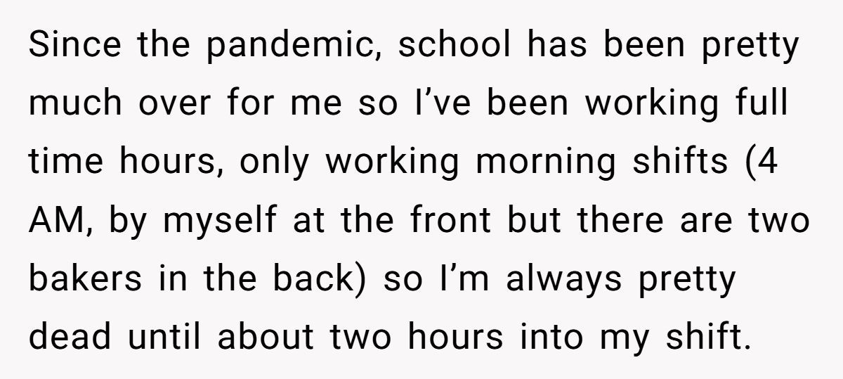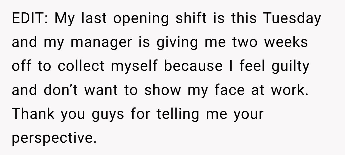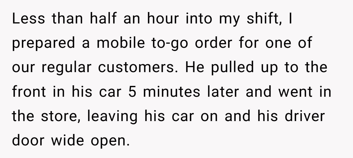 The Redditor shared the story with raw honesty: she was tired, focused, and doing her best. The early hours were always the hardest, especially when working solo. That morning, she’d been prepping orders when the regular customer walked in. He was someone she recognized, someone who came in often. She barely glanced up as he ordered.
