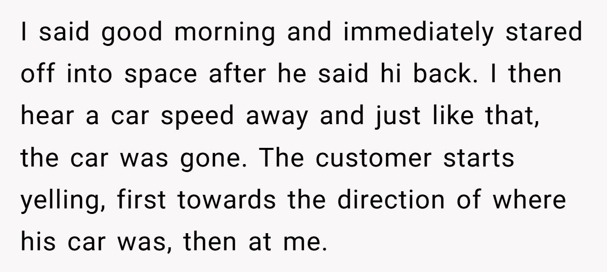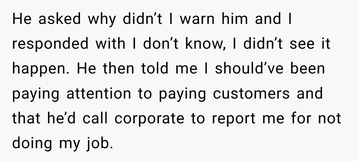 The man demanded to know why she hadn’t seen it happening, why she didn’t do something, why she wasn’t “paying attention.” He threatened to go to her manager, to corporate, even to file a lawsuit. The barista tried to stay composed, but the verbal attack cut deep. She felt embarrassed, blindsided, and completely helpless.
