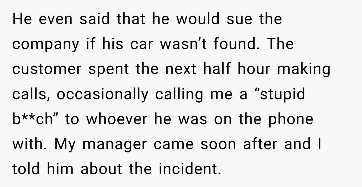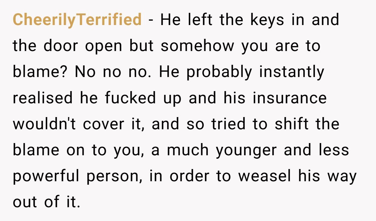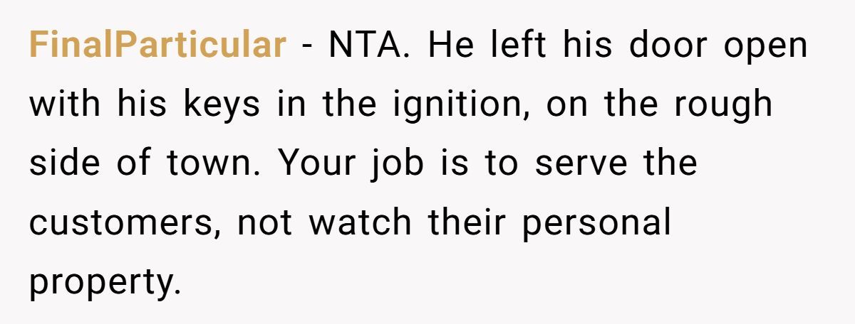 Workplace culture expert Alison Green tackled similar dilemmas in a 2024 Slate article, writing, “Employees aren’t liable for customers’ personal property—clear boundaries prevent unfair blame.” In this case, the customer’s anger seems rooted more in embarrassment than reason. After all, he left his car vulnerable, running, unlocked, and unattended in a high-crime area. Insurance companies rarely honor theft claims under those conditions.