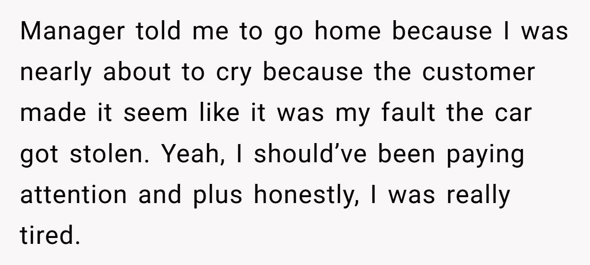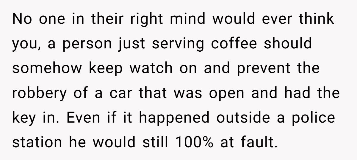 Stunned and shaken, the girl was sent home in tears. Her hands may have been on a latte, but suddenly she was holding responsibility for a car theft. And now, Reddit is ablaze with opinions: Was she guilty of negligence—or was she just the unlucky witness to a customer’s terrible decision?
