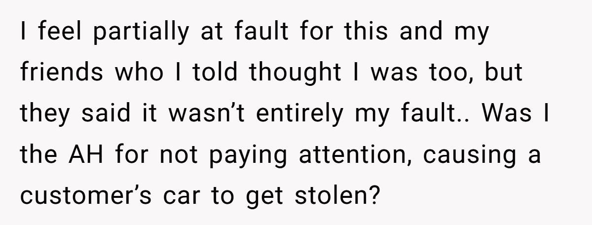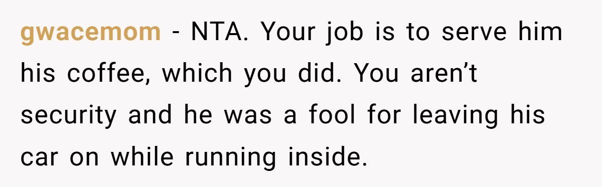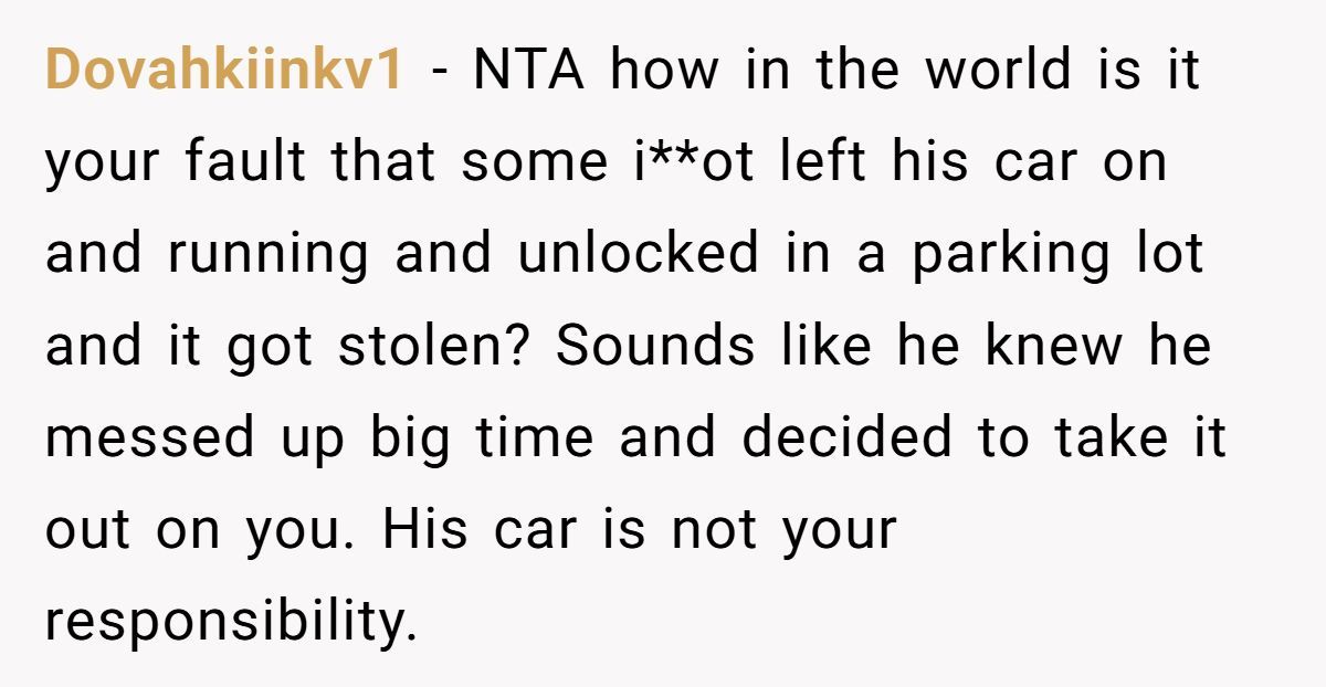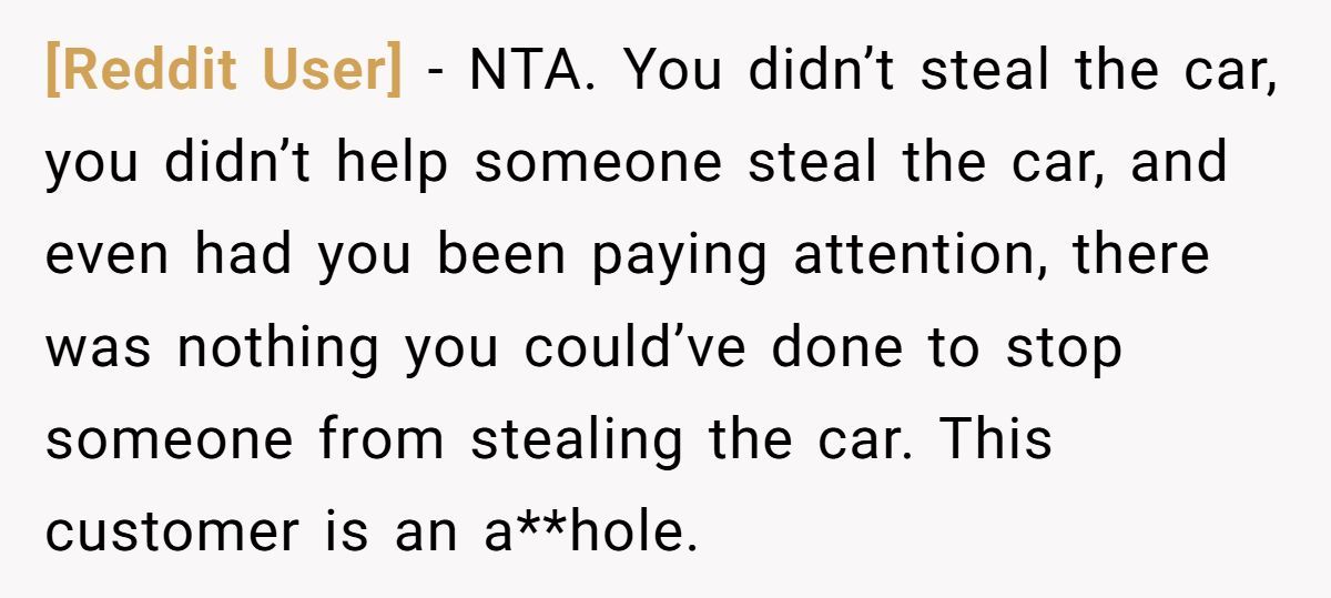 Reddit users agreed the poster was not at fault — she didn’t steal the car, wasn’t responsible for watching it, and the customer was careless for leaving it running.