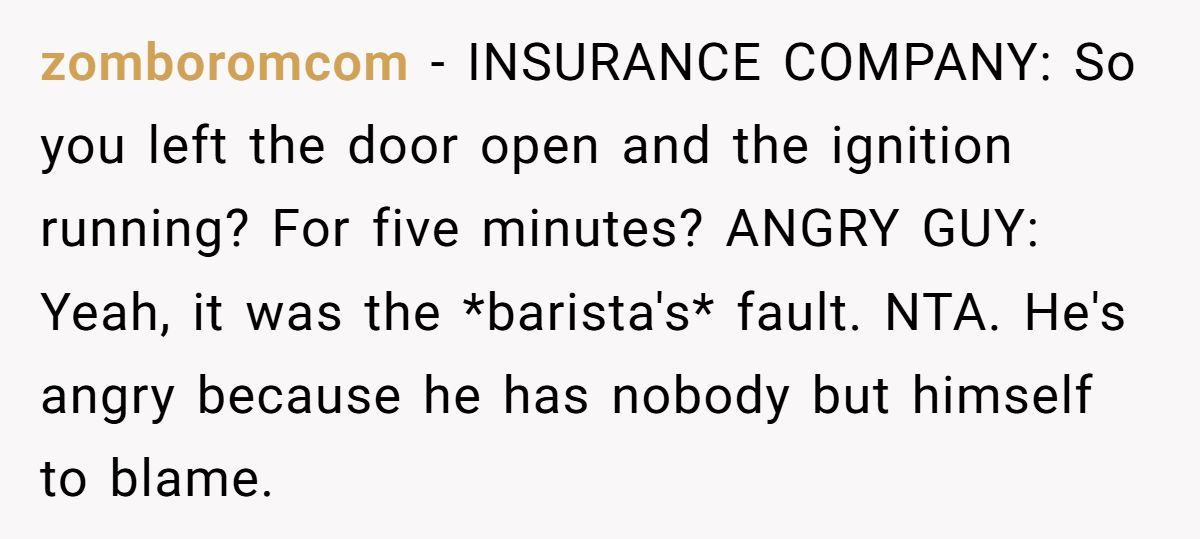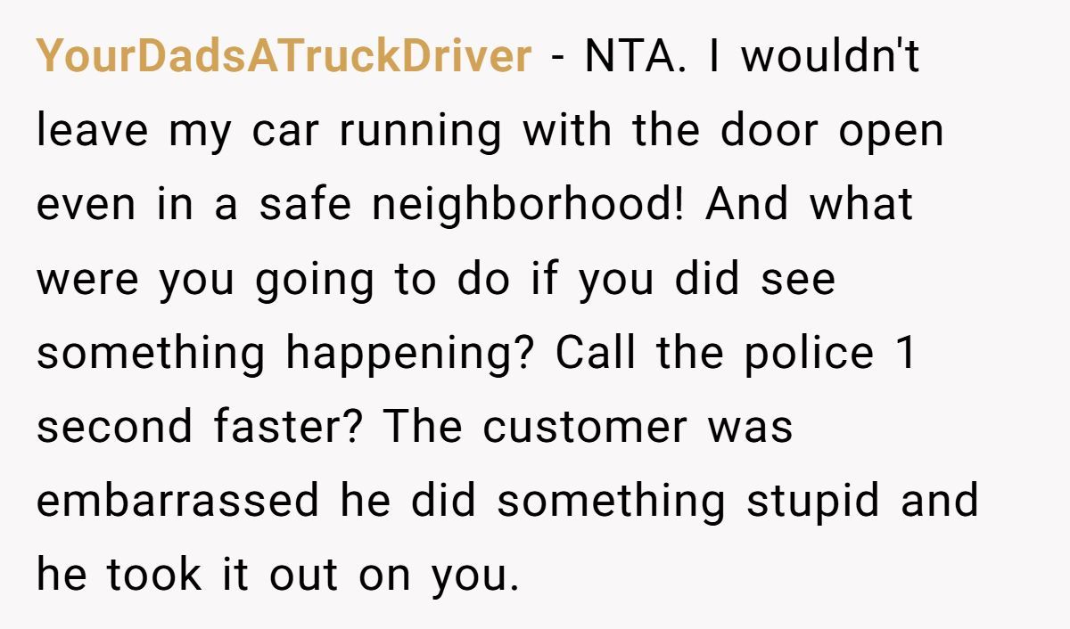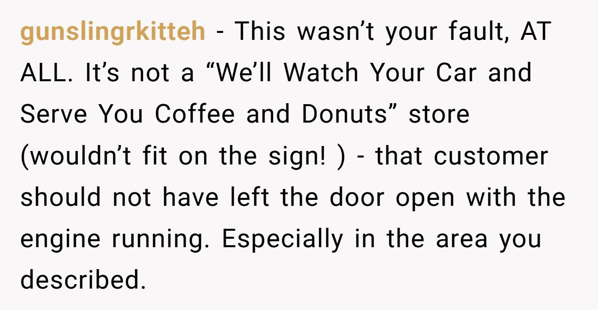 Redditors agreed the woman wasn’t to blame. The customer left his car running with the door open and then tried to shift the blame when it was stolen.