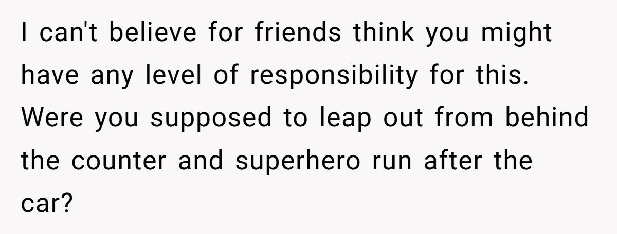 Still, it’s easy to see how guilt could creep in for a 17-year-old who was just trying to do her job. Could she have shouted a warning if she had noticed the thief? Possibly. But is it fair—or even remotely realistic—to expect her to monitor the parking lot like a security guard while also managing the shop?