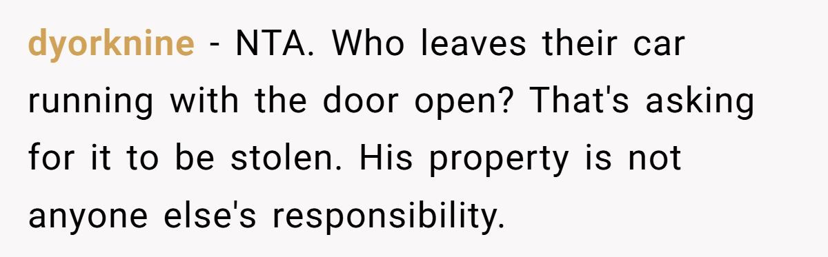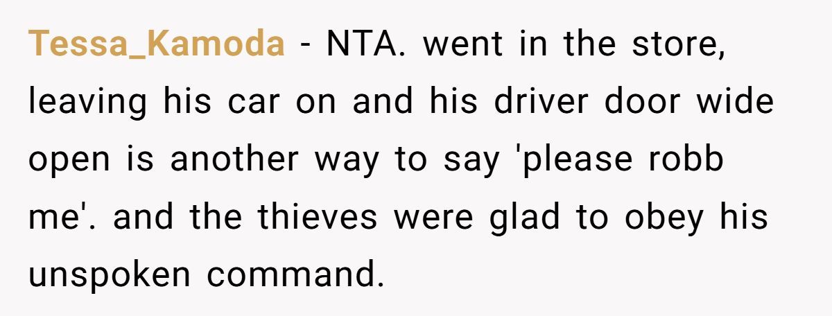 Redditors agree the man had only himself to blame for leaving his car running with the door wide open, calling his actions an open invitation to thieves.