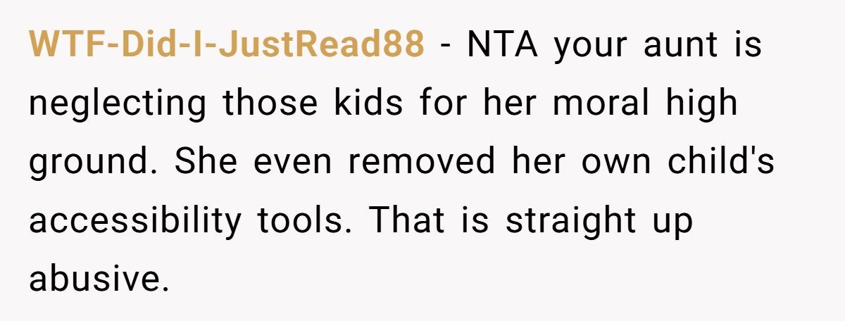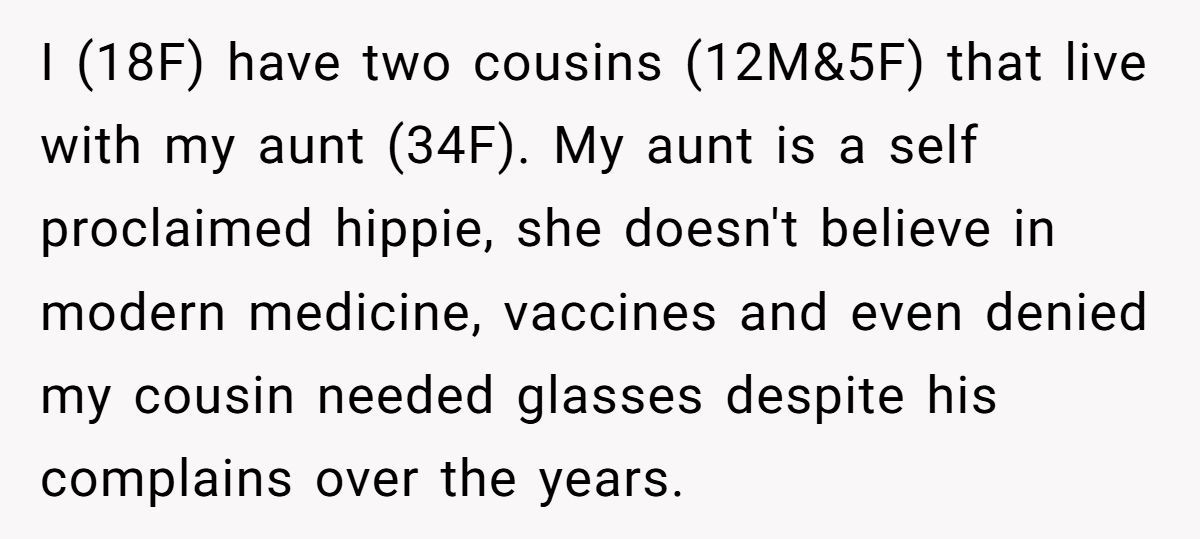 Our Redditor stepped in to help her aunt with babysitting duties—expecting maybe a few tantrums, not a deep dive into child wellness reform. But what she found shocked her: underweight kids, no sweets or fats, and a 12-year-old who couldn’t see clearly because his mom doesn’t “believe” in glasses.