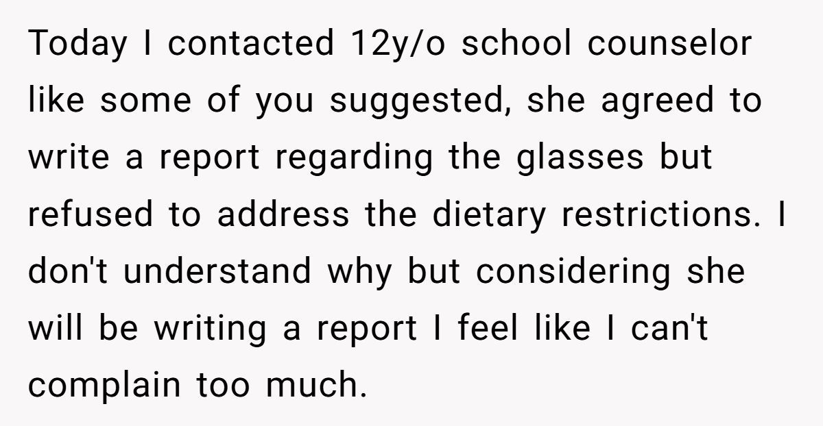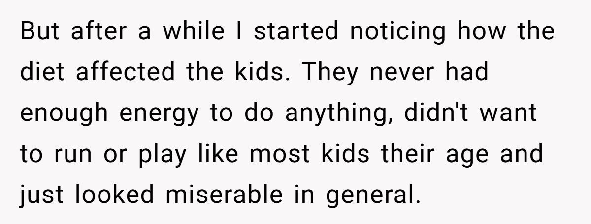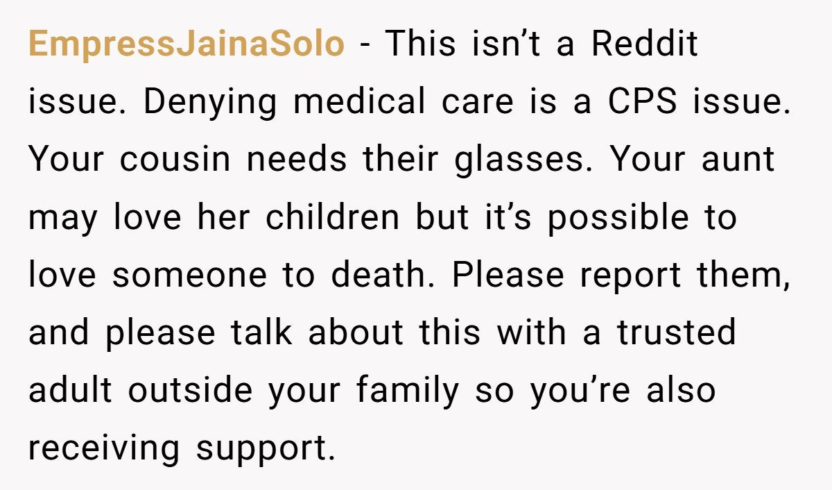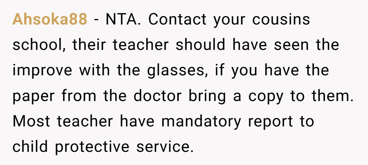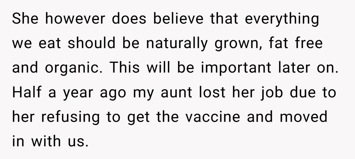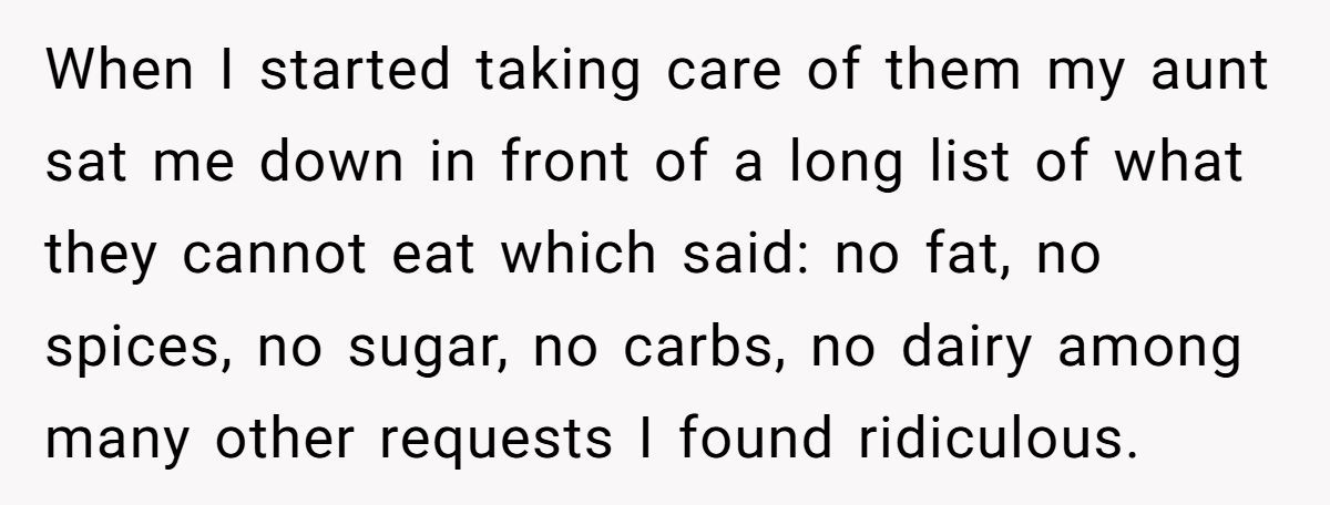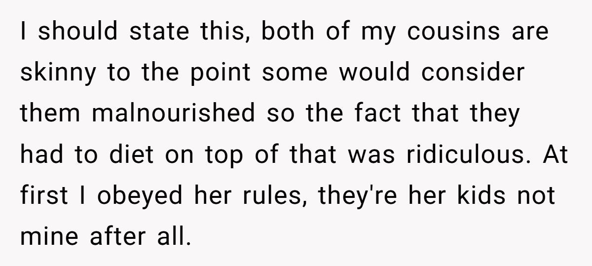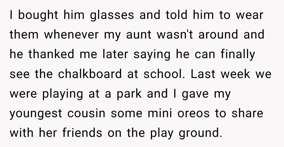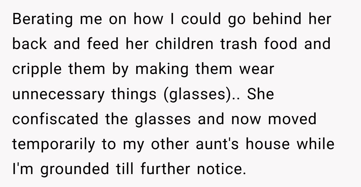 Her aunt has strict rules: no sugar, no fat, no processed anything. But when the Redditor noticed the kids looking pale and run-down—and one cousin squinting at everything—she couldn’t stay quiet. She started slipping them healthier (but still tasty) meals and even took the 12-year-old to get glasses for his blurry vision.