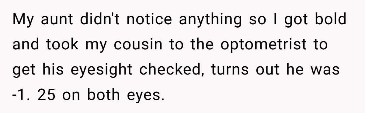 So, she did what most people would consider reasonable: made sure they ate more balanced meals and quietly took her cousin for an eye exam. The result? Happier kids who weren’t falling asleep at 3 p.m. and a boy who could finally see the whiteboard at school.