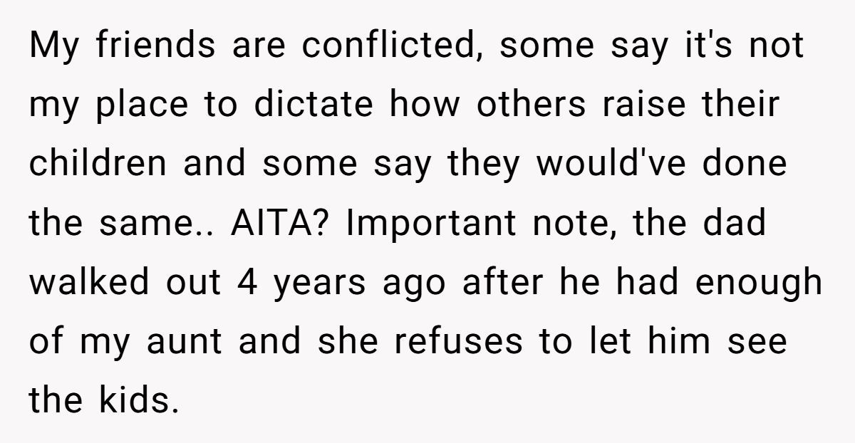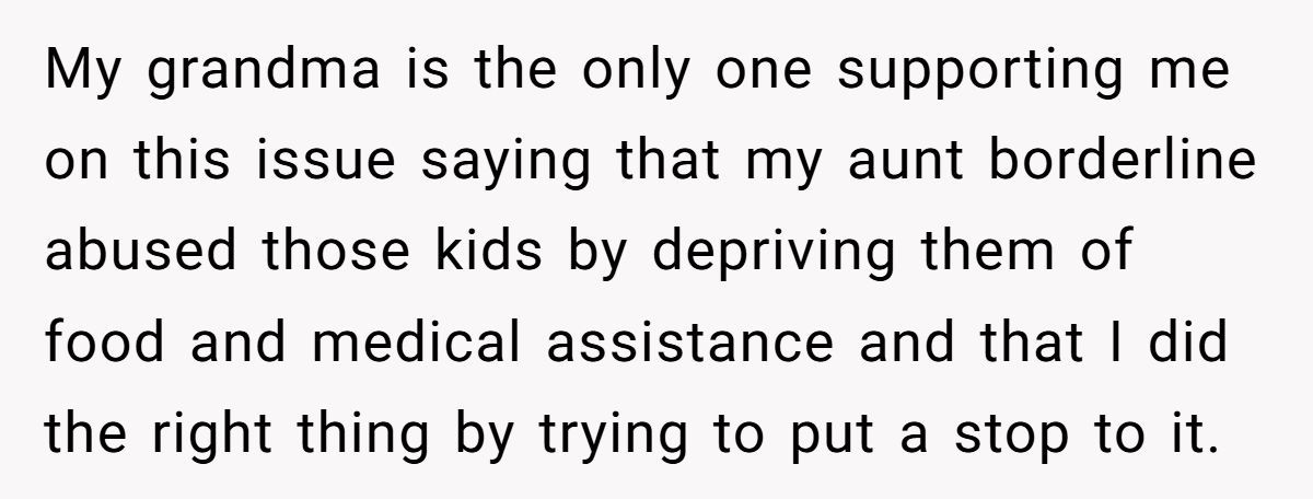 Still, her aunt sees it as a betrayal. Now grounded and under fire, the Redditor’s wondering if she went too far. But with the kids’ health on the line, was defying a few rules actually the right move?