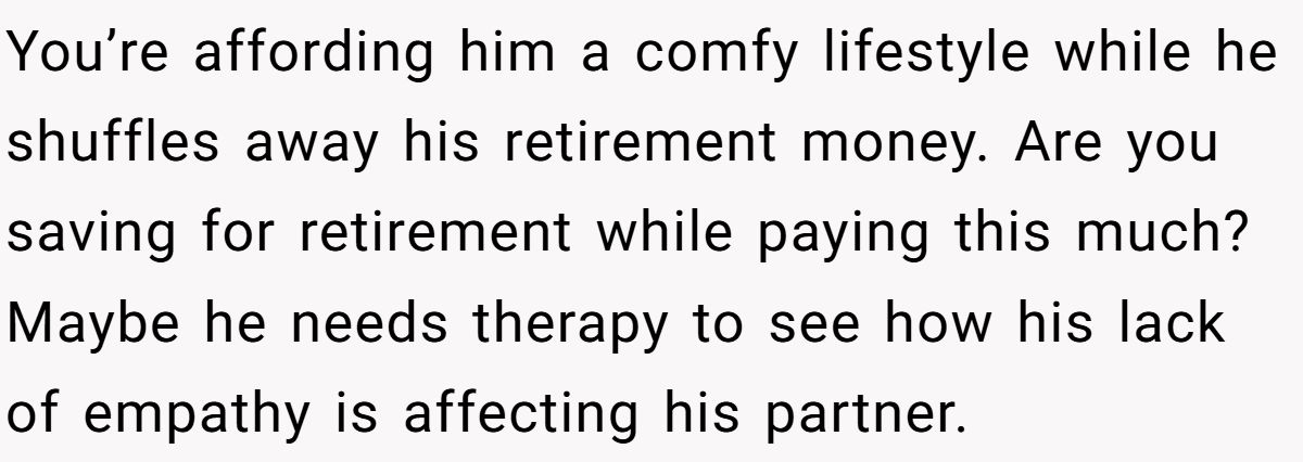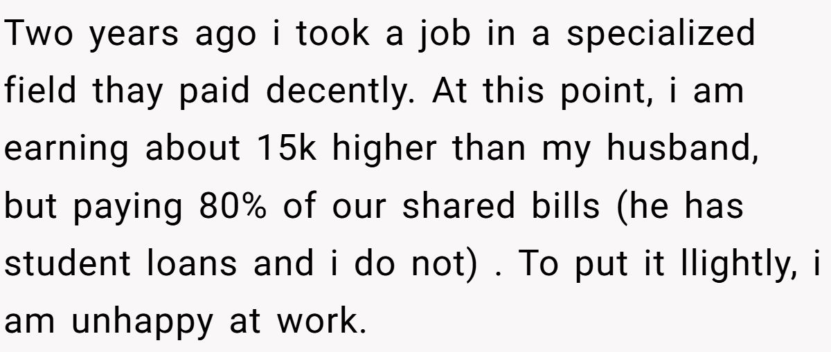 Every evening repeats the same routine: she cooks dinner with a hollow ache in her chest, tidies the kitchen, and collapses into bed, only to rise again and shoulder 80% of their household expenses. She earns $15,000 more a year than him in a high-pressure field she can barely stand. And yet, any hope of relief is crushed every time he quietly redirects his recent pay raise into his retirement fund, never offering to help more with their shared bills.