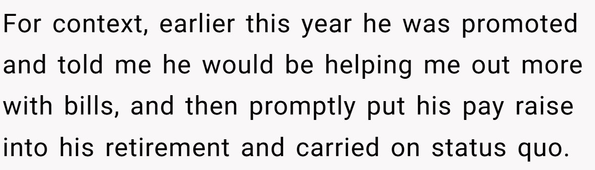 When he received his raise, a flicker of hope lit inside her: maybe now he’d volunteer to cover more. Maybe she could finally consider stepping back from the work that was slowly grinding her down. But instead, he calmly explained he’d be putting the extra income into his retirement savings.