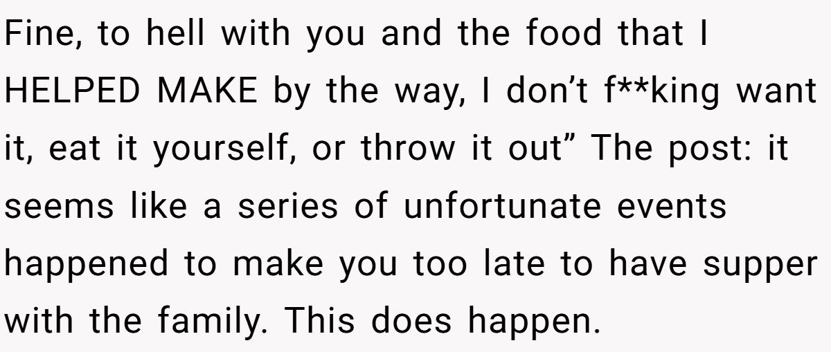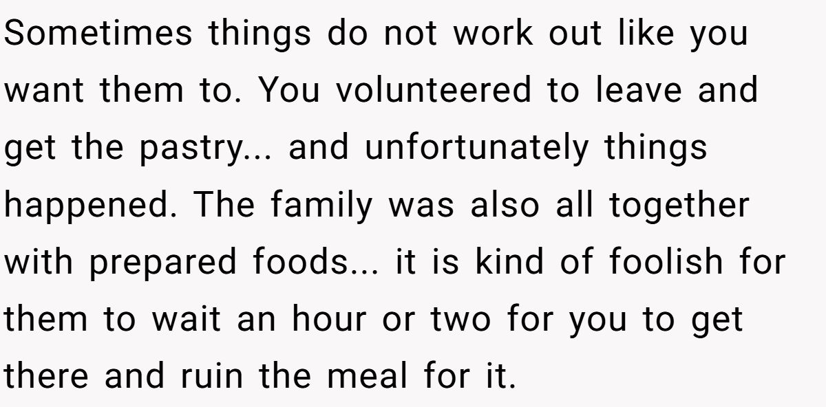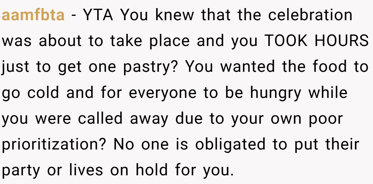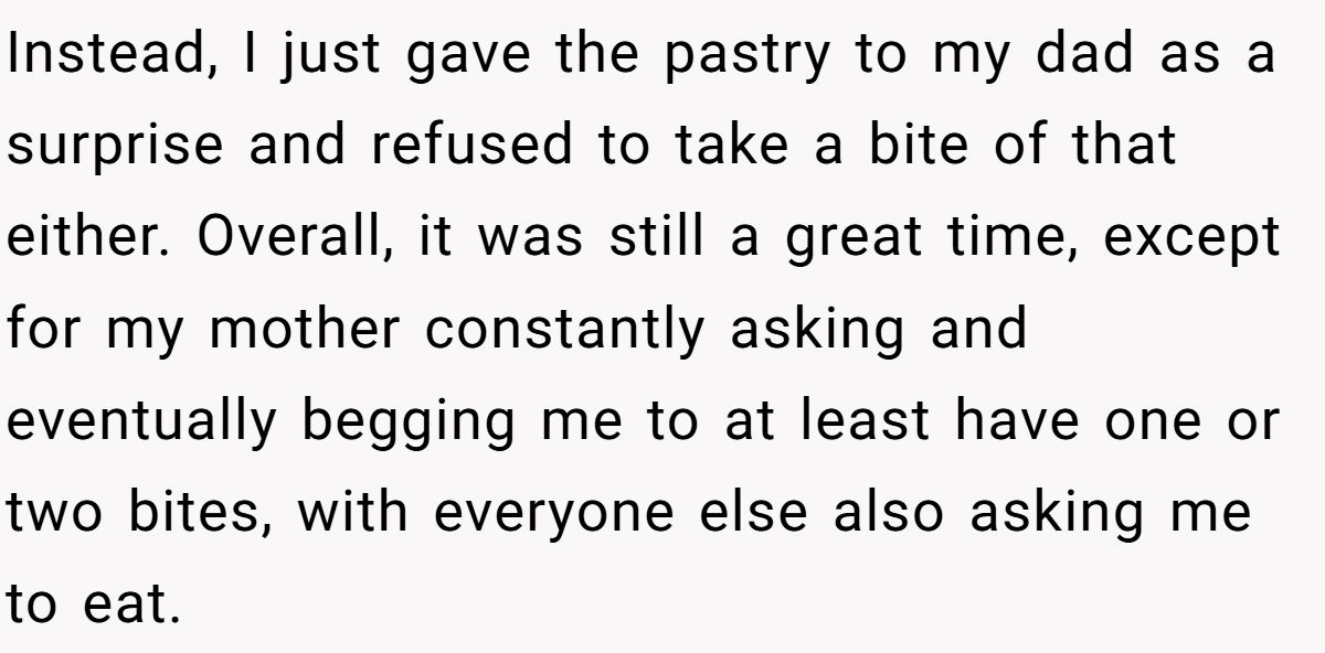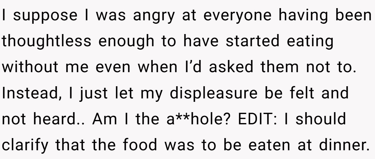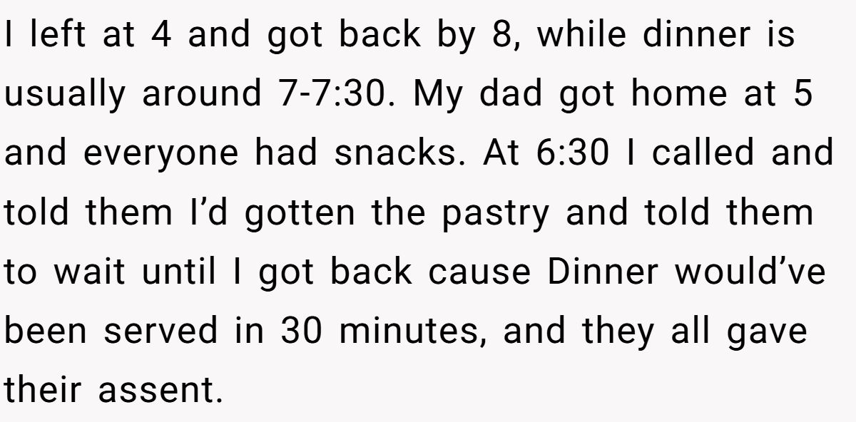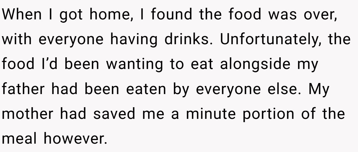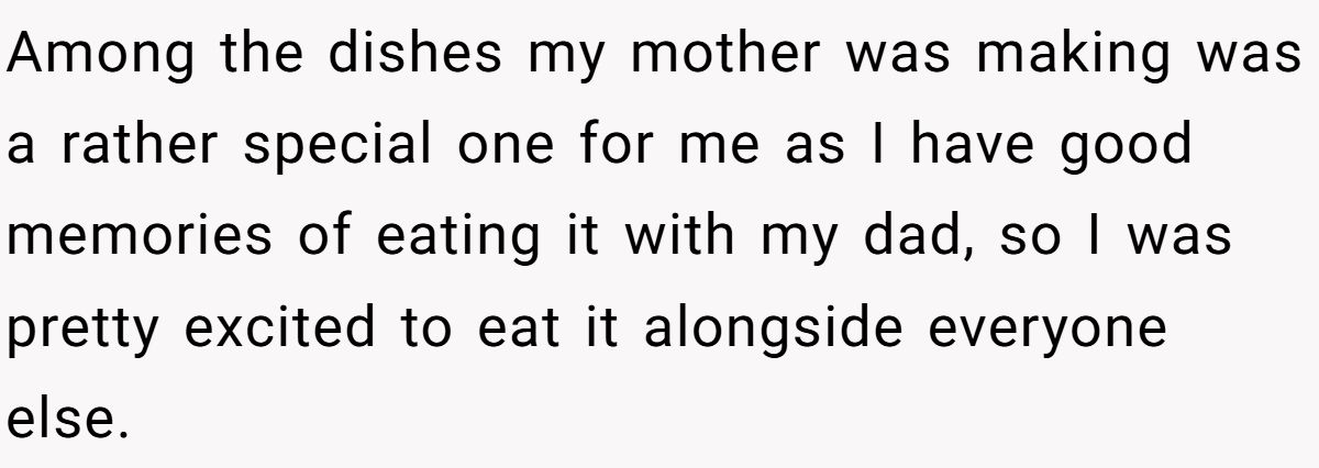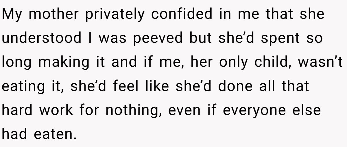 By the time they returned, the table was bare. Only a small portion remained, saved almost like an afterthought. When they asked why no one waited, their mother shrugged that everyone was too hungry and excited to hold off. The Redditor felt invisible, as if all their care and effort had meant nothing.