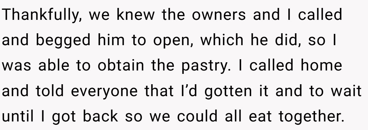 But when they walked back in the door, arms full of the treat they knew would make the night complete, all they saw were empty plates and crumbs. The family had devoured everything without waiting. In that moment, their excitement collapsed into a hollow ache.