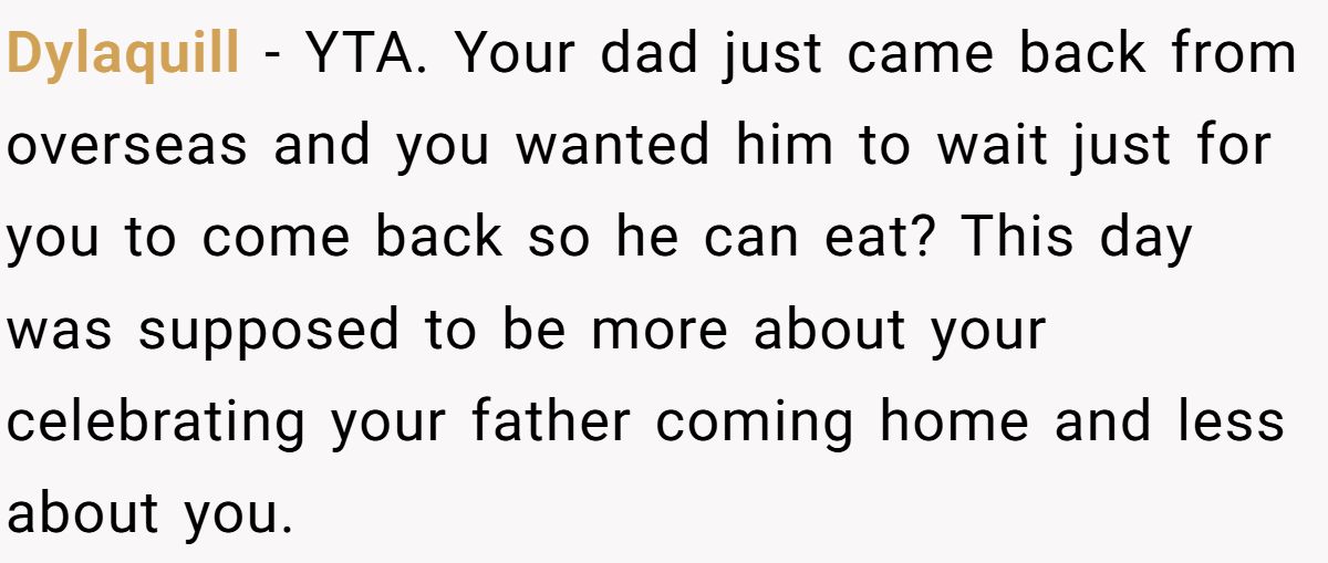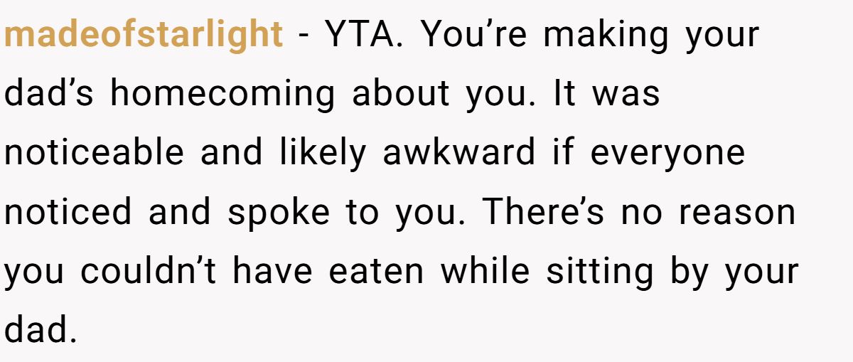 Most commenters agreed the Redditor was selfish and petty for making the homecoming about themselves instead of celebrating their dad.