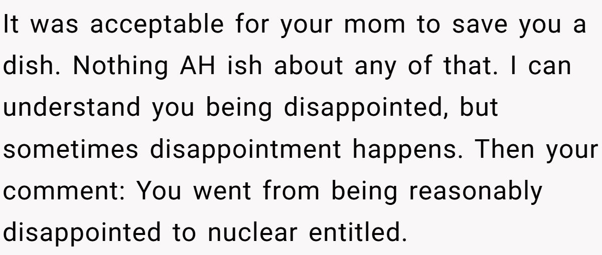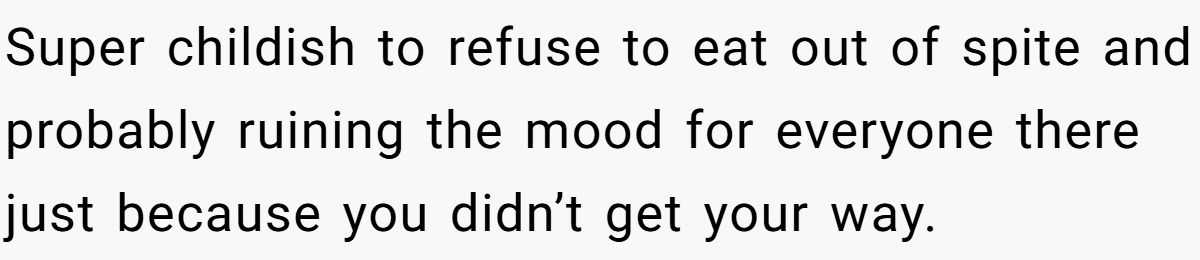 Meanwhile, others felt the Redditor’s reaction went too far, arguing that refusing to eat turned an already disappointing evening into an unnecessary standoff.