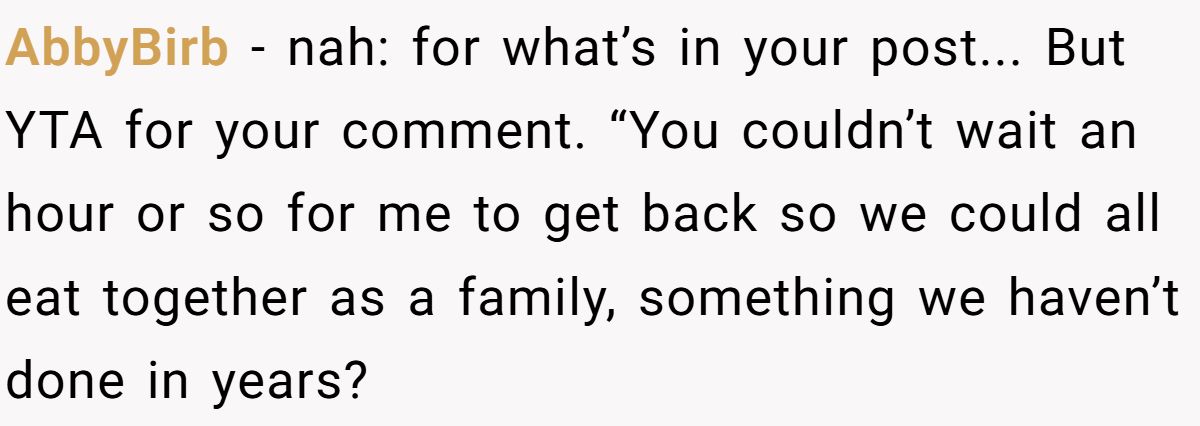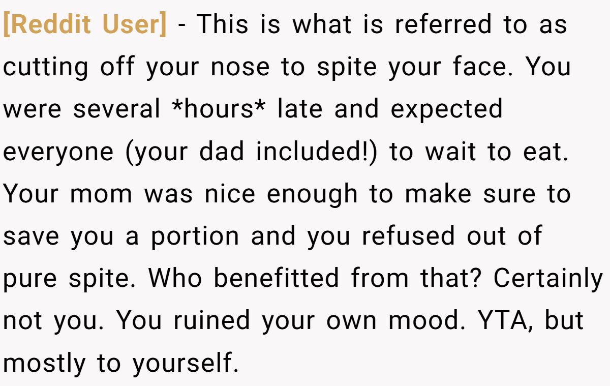 ![A Woman Refused To Eat Food After The Meal Was Eaten Without Her [Reddit User] − This is what is referred to as cutting off your nose to spite your face. You were several *hours* late and expected everyone (your dad included!) to wait to eat. Your mom was nice enough to make sure to save you a portion and you refused out of pure spite. Who benefitted from that? Certainly not you. You ruined your own mood. YTA, but mostly to yourself.](https://dailyhighlight.com/wp-content/uploads/2025/07/dasd-29.jpg)