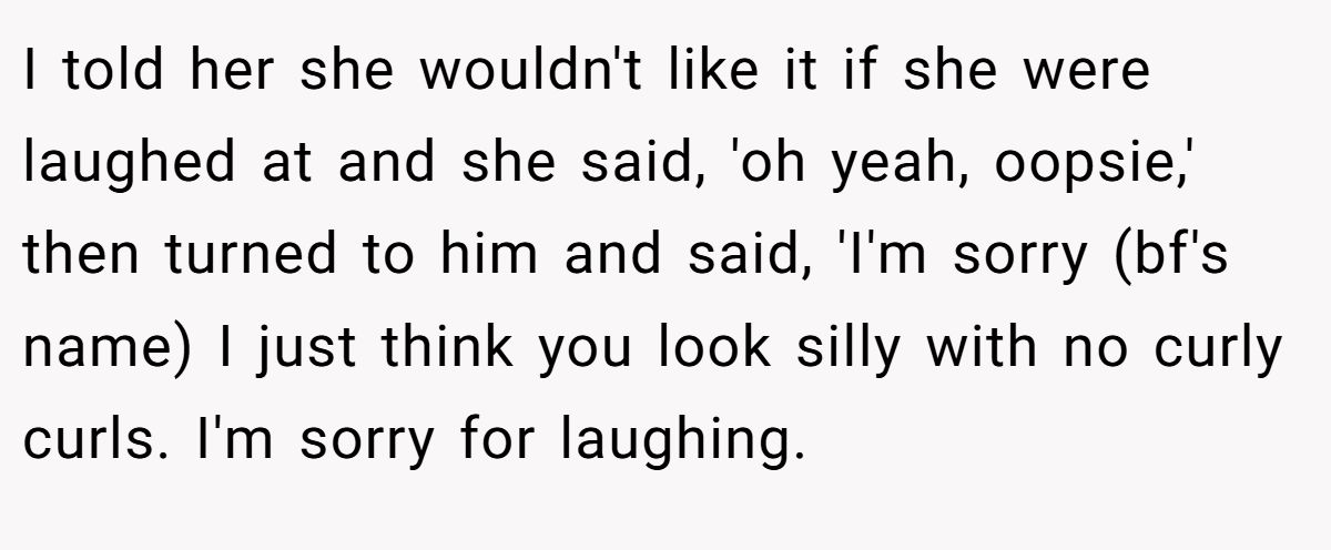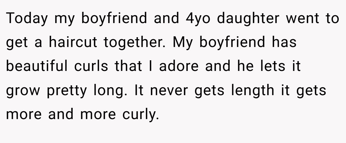A little laugh from a four-year-old should never spiral into emotional punishment, but that’s exactly what happened here. After watching her boyfriend chop off his signature curls, the Redditor’s daughter giggled and called him “silly”—not with cruelty, but with the blunt honesty only kids have. She quickly realized it wasn’t kind, apologized, and tried to make it right. Most adults would’ve let it go.