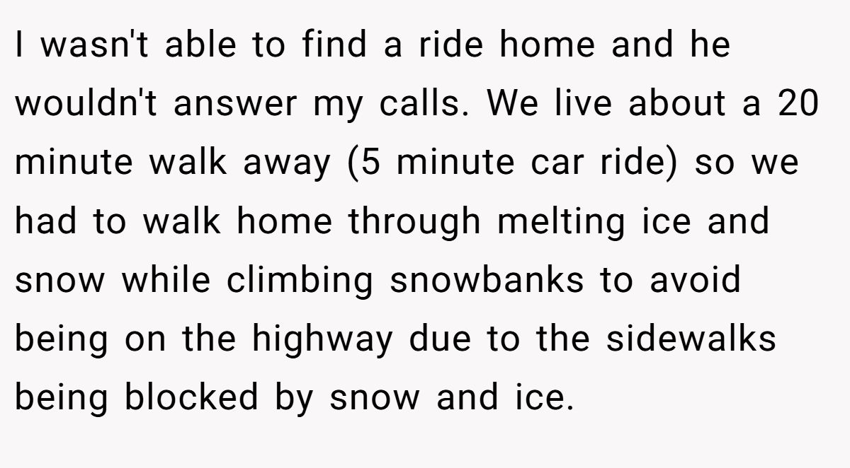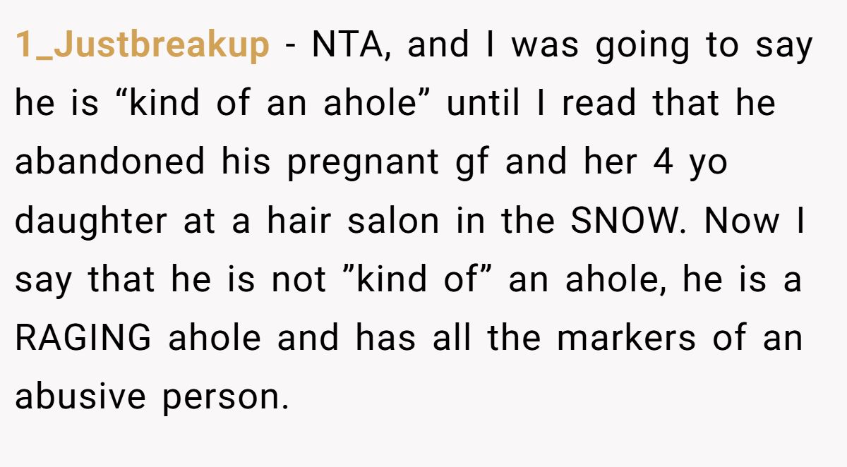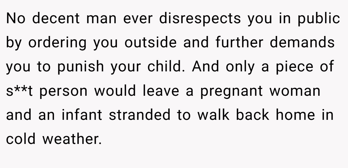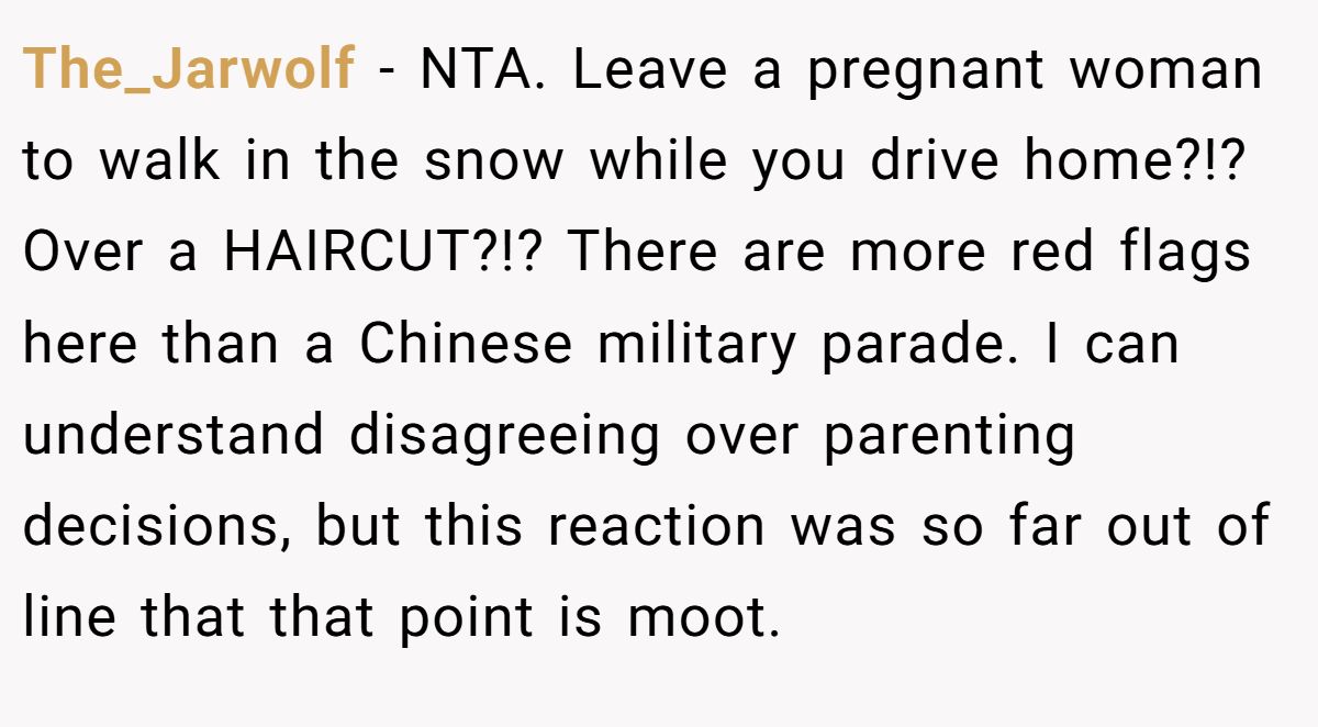 Could this be worked through? Maybe. But right now, the Redditor’s focus needs to be on her safety and her daughter’s emotional well-being. Walking through slushy snow with a four-year-old while pregnant isn’t just uncomfortable—it’s scary. And being left to face that alone raises serious questions about whether this relationship is built on support or control.