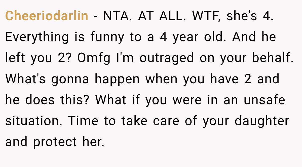 Reddit user Cheeriodarlin passionately defends the original poster (OP), slamming her boyfriend’s outrageous decision to abandon a pregnant woman and her 4-year-old daughter over a harmless remark, urging OP to prioritize her daughter’s safety and well-being.
