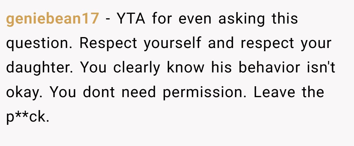 Reddit user geniebean17 sharply criticizes the original poster (OP) for seeking validation on her boyfriend’s unacceptable behavior, urging her to respect herself and her daughter by leaving the relationship without hesitation.