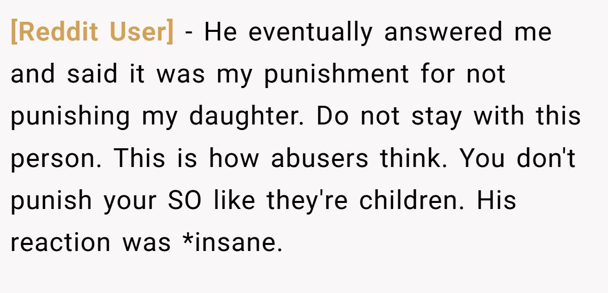 An anonymous Reddit user labels the boyfriend’s justification of abandoning the original poster (OP) as “punishment” for not disciplining her daughter as a clear sign of abusive behavior, strongly advising OP to end the relationship immediately.