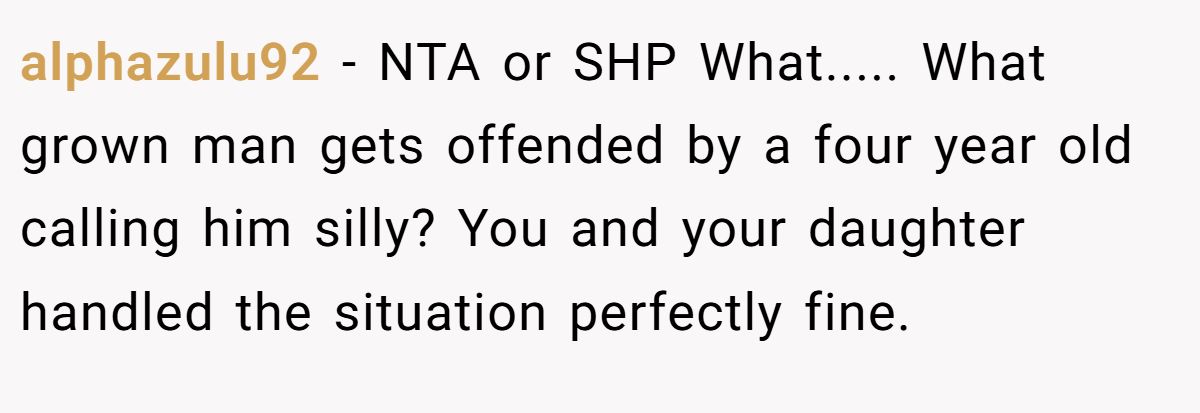 Reddit user alphazulu92 backs the original poster (OP) as Not The Asshole (NTA), expressing disbelief at her boyfriend’s overreaction to a 4-year-old’s harmless comment and labeling his abandonment of OP and her daughter as utterly deplorable, questioning if such behavior has occurred before.