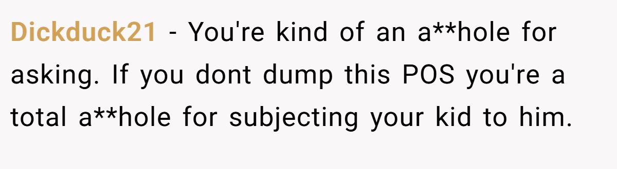 Dickduck21 harshly critiques the original poster (OP) for even questioning her boyfriend’s actions, warning that failing to end the relationship would irresponsibly expose her daughter to a toxic individual.