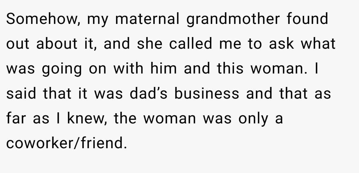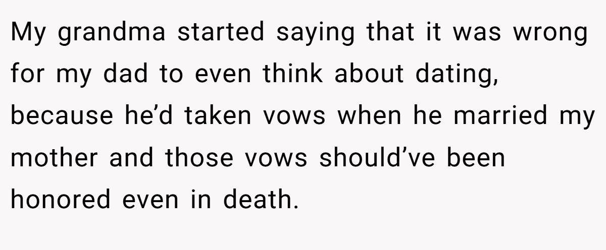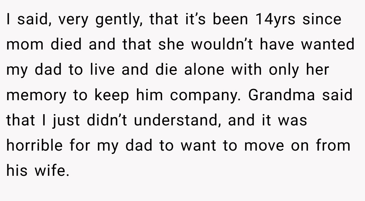 But when her maternal grandma found out about the potential date, it sparked an emotional storm. To Grandma, this was a betrayal of her daughter’s memory, and the Redditor’s response, “Dad shouldn’t be expected to mourn forever”, hit like a thunderclap, leaving Grandma speechless.