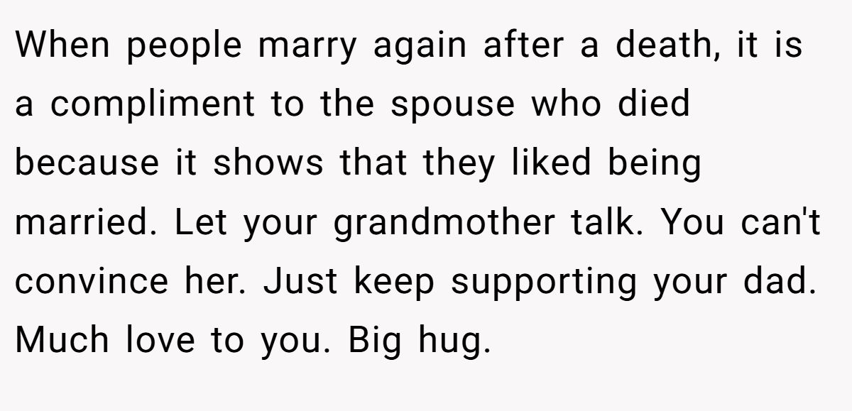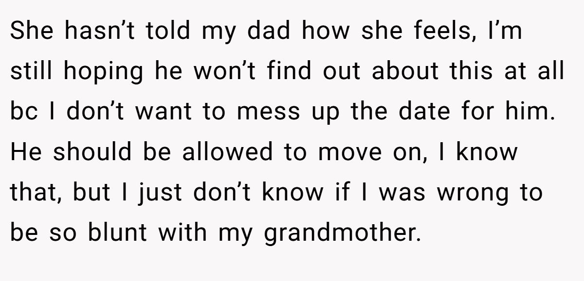While a softer approach could have eased some of Grandma’s pain, perhaps acknowledging that “Dad’s happiness doesn’t replace Mom’s memory”, the Redditor’s honesty was also necessary. She’s standing up for her dad’s right to live fully, and that’s something worth supporting.