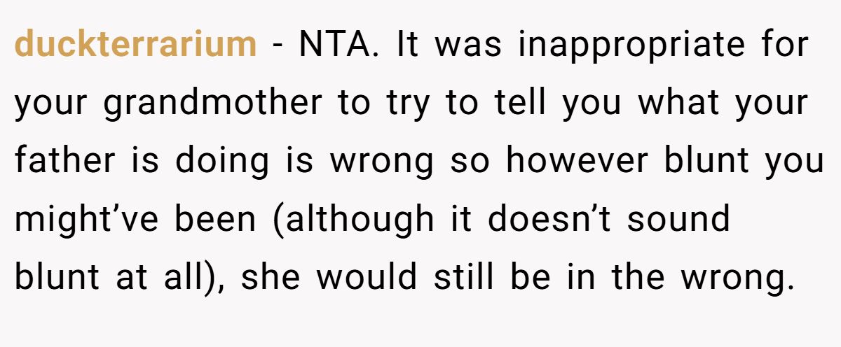 Reddit user duckterrarium supports the original poster (OP) as Not The Asshole (NTA), asserting that the grandmother’s attempt to criticize the father’s decision to move on was inappropriate, and OP’s response, regardless of its bluntness, was justified as they navigate changes in family dynamics.