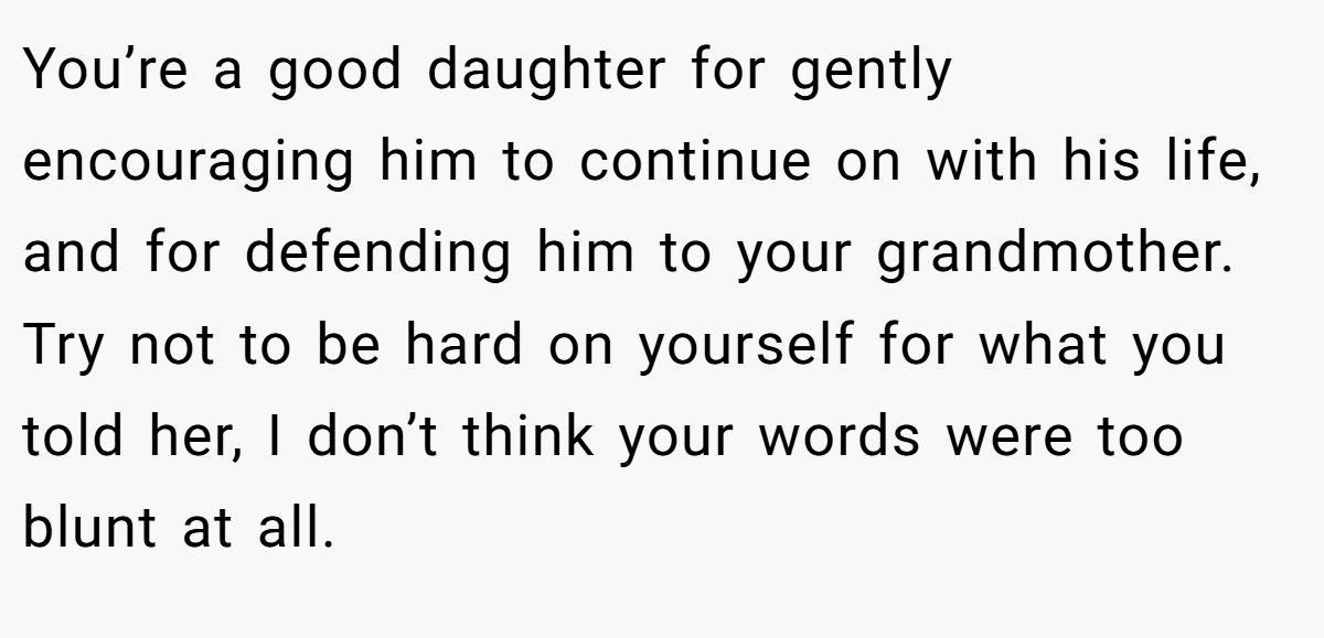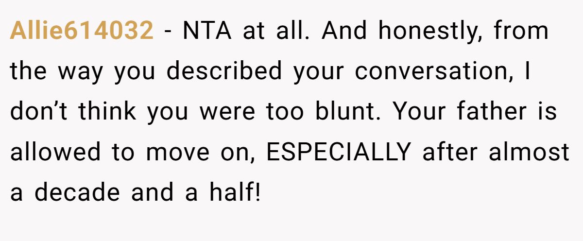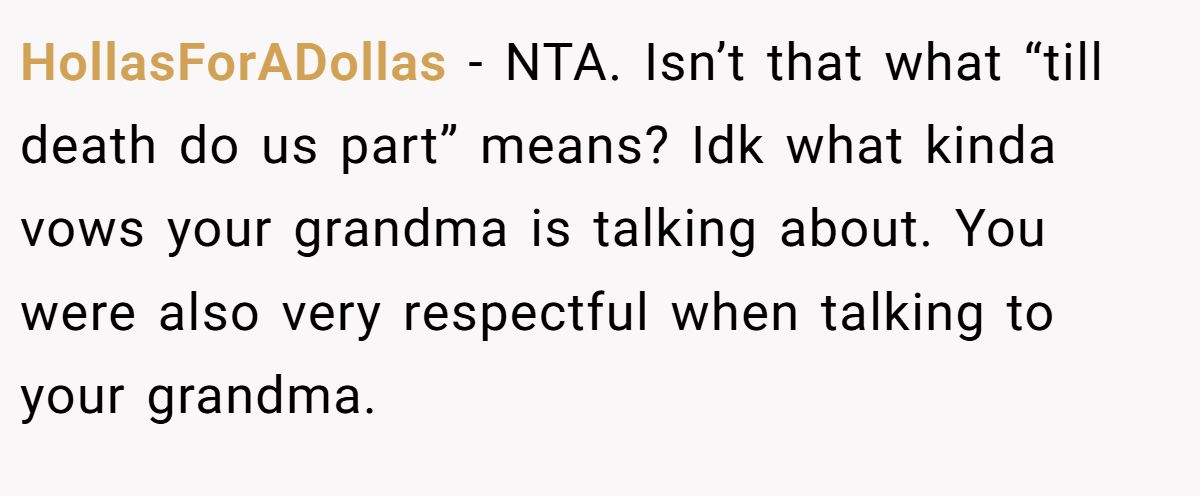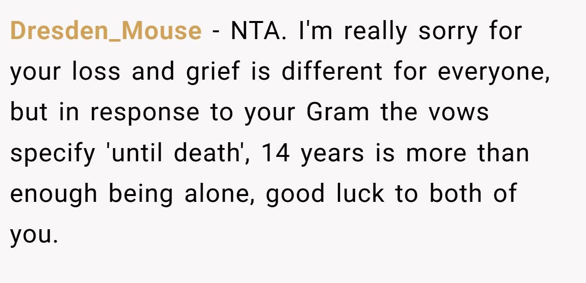 Allie614032 firmly backs the original poster (OP) as Not The Asshole (NTA), arguing that OP’s conversation with their grandmother was not overly blunt and emphasizing that the father is fully entitled to move on nearly 14 years after his wife’s passing, as marriage vows end at death.