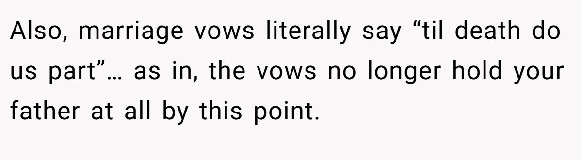 He’s clearly devoted, but as Sonsangnim pointed out, wedding vows are meant to end “till death do us part.” The Redditor’s dad never wanted to date before, but now, his new connection is helping him rediscover happiness.