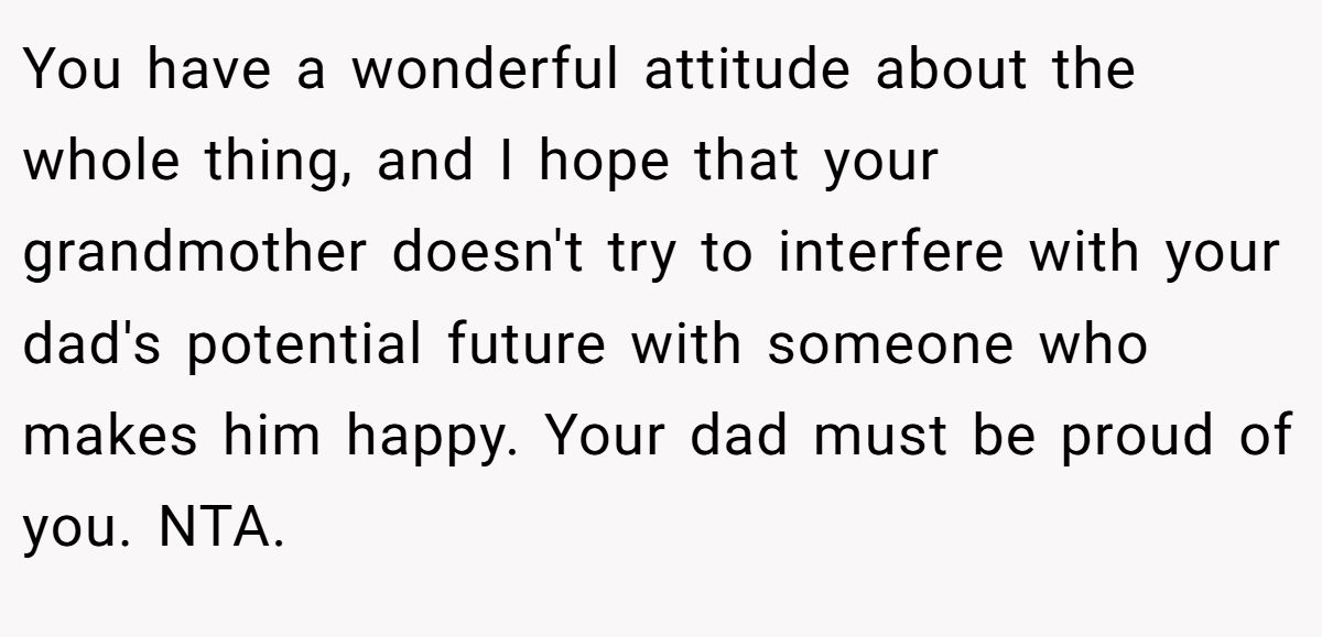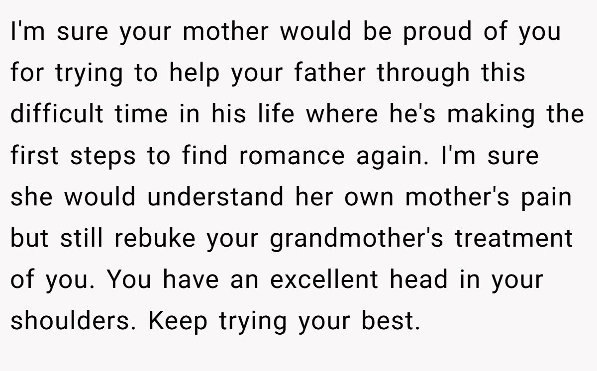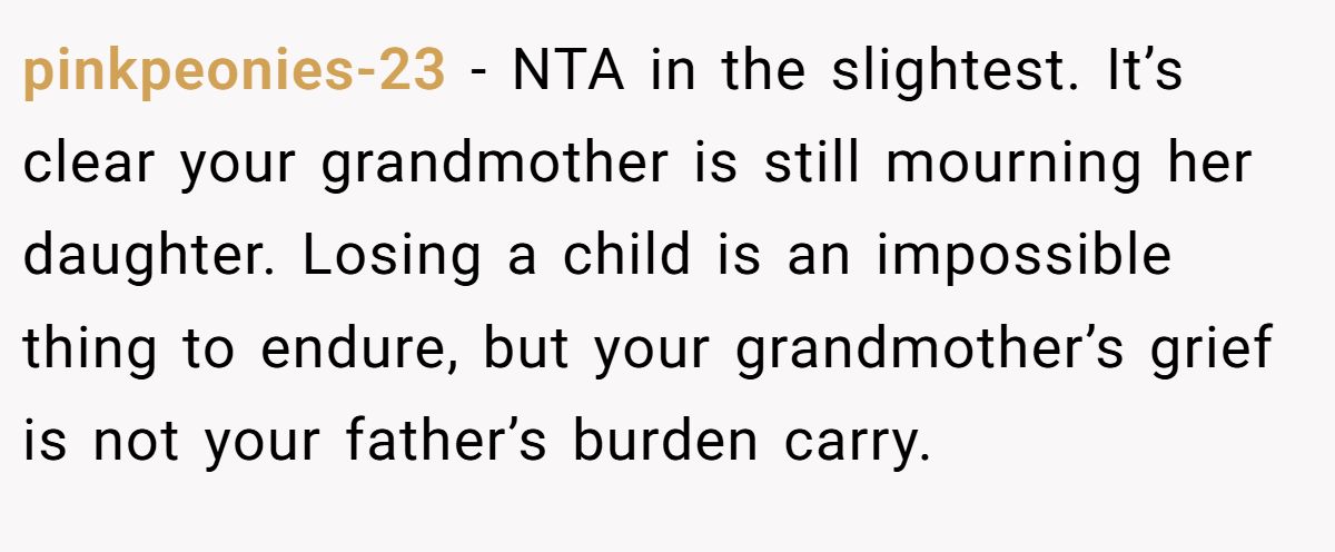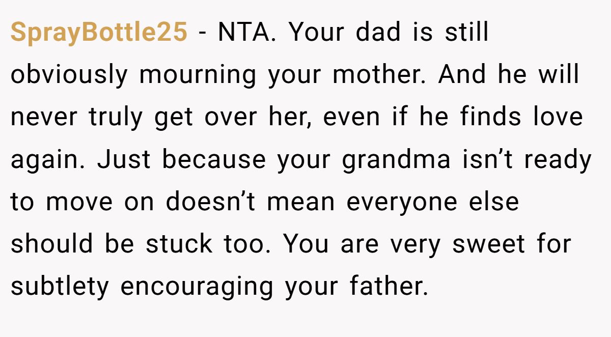 Reddit user pinkpeonies-23 declares the original poster (OP) Not The Asshole (NTA), acknowledging the grandmother’s ongoing grief but stressing that it should not burden the father’s right to move forward after 14 years, commending OP for gently supporting their father’s new chapter.