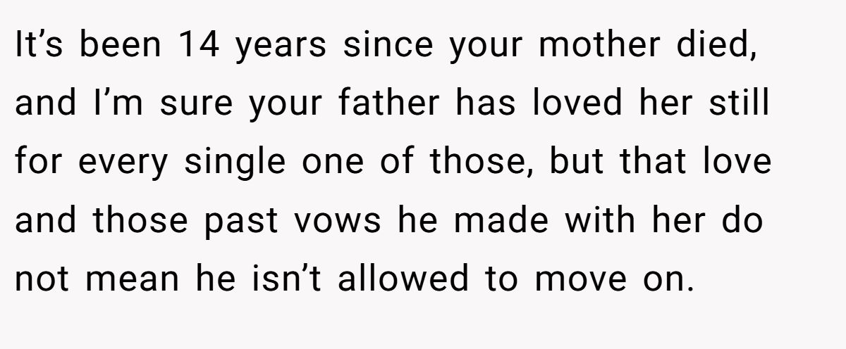 Family ties can feel like a tightrope when grief is in the mix, and this Redditor’s story is a poignant example. Her dad, a widower for 14 years, is finally smiling again, thanks to a flirty coworker who’s brought joy back into his life.