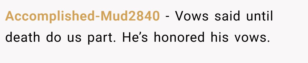 Accomplished-Mud2840 succinctly supports the original poster (OP) as Not The Asshole (NTA), stating that the father has fulfilled his marriage vows.