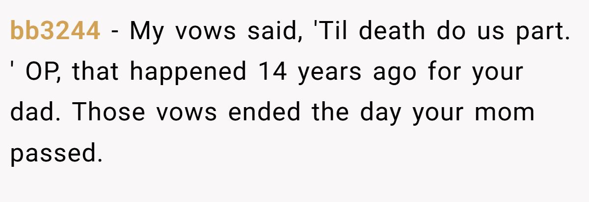Reddit user Dresden_Mouse affirms the original poster (OP) as Not The Asshole (NTA), expressing sympathy for their loss while underscoring that 14 years is ample time for the father to move on, as marriage vows conclude at death, and wishing both OP and their father well.