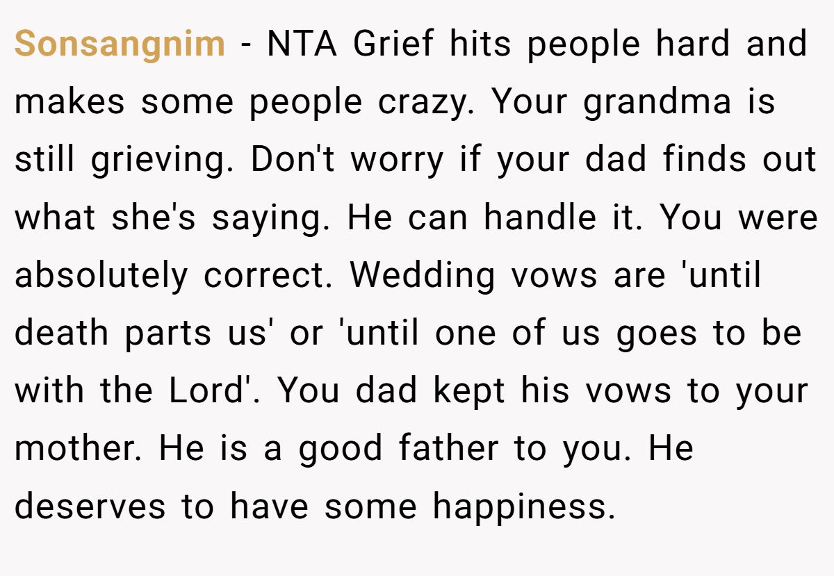 Reddit user Sonsangnim declares the original poster (OP) Not The Asshole (NTA), acknowledging the grandmother’s grief but affirming that the father has honored his vows and deserves happiness.