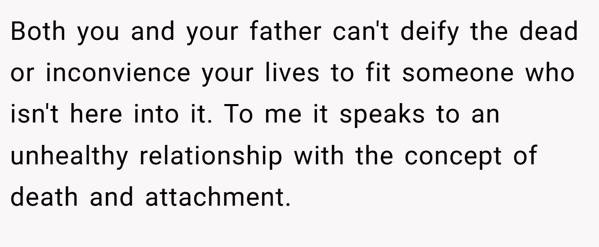 An anonymous commenter praises the original poster (OP) as Not The Asshole (NTA) for their tactful handling of a delicate situation, affirming that neither OP nor their father should be bound by the grandmother’s unhealthy attachment to the deceased.
