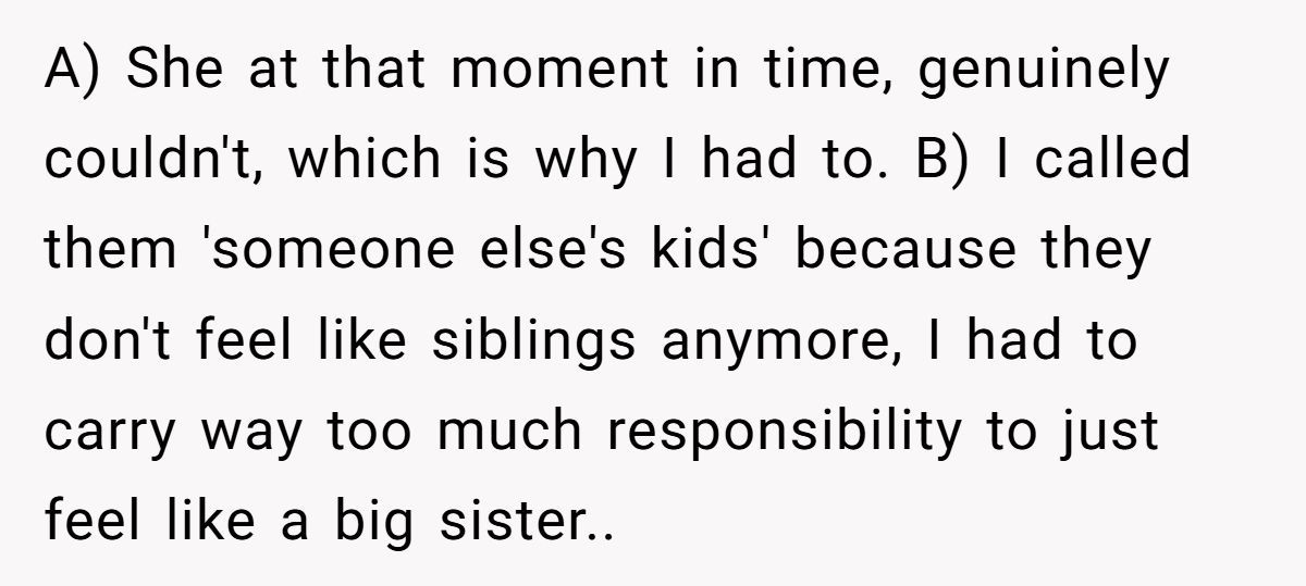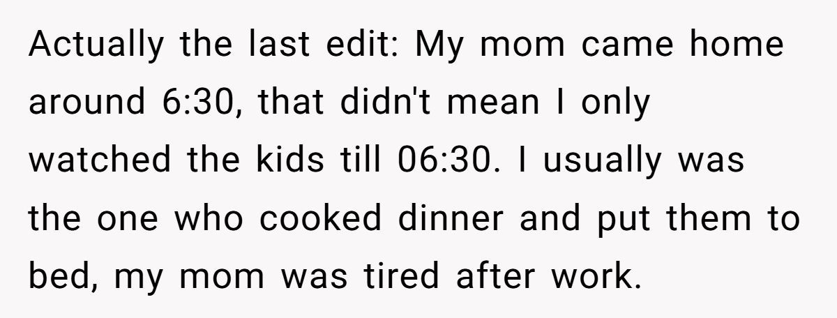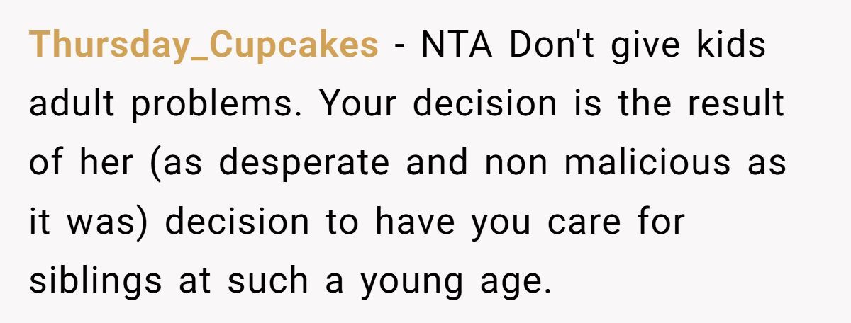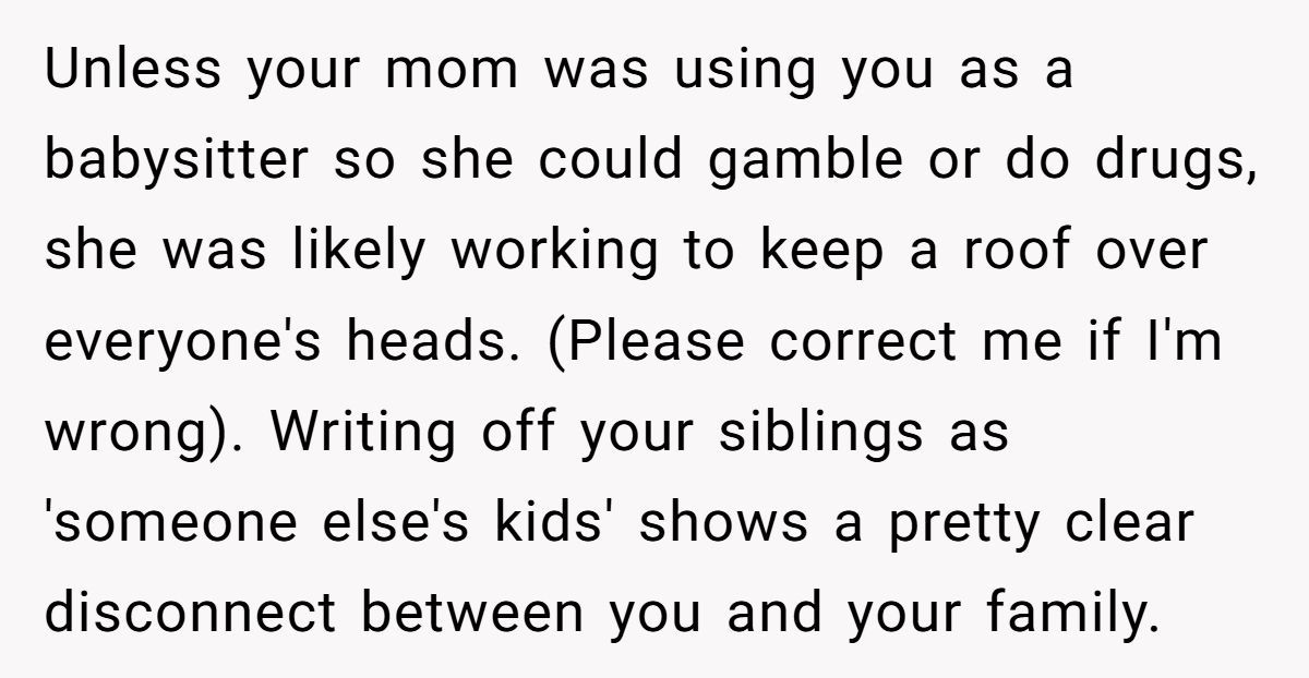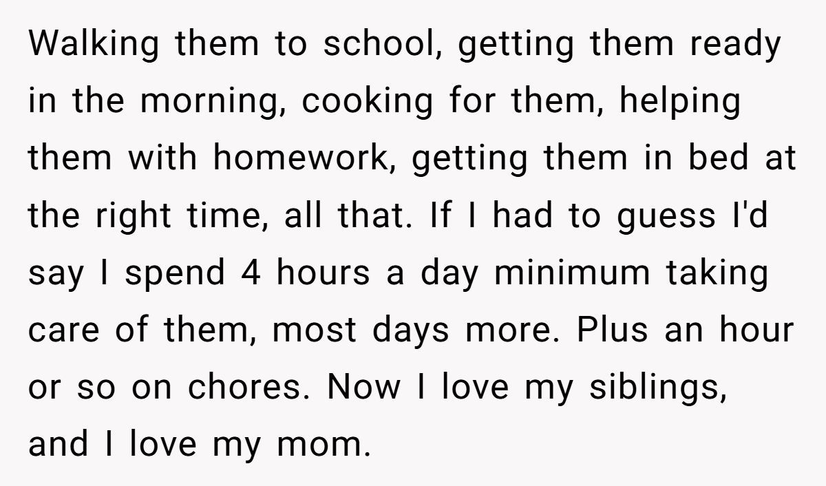 Still, the Redditor’s word choice stung. Calling her siblings “someone else’s kids” felt cold, even if she meant it as a reflection of her role, not a rejection of family. Both sides have merit: the mom’s desperation and the daughter’s lost adolescence.