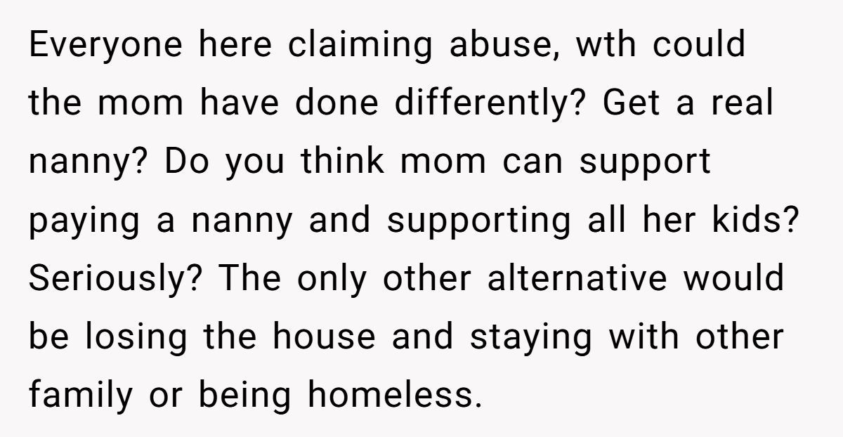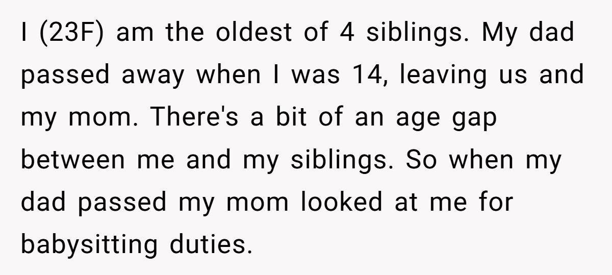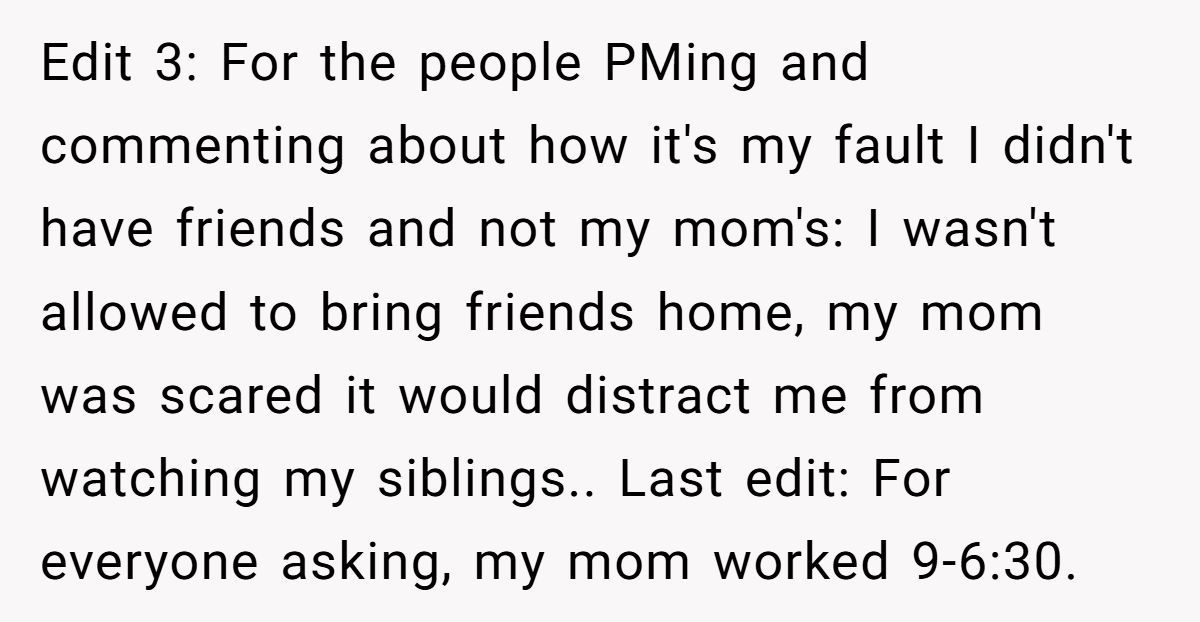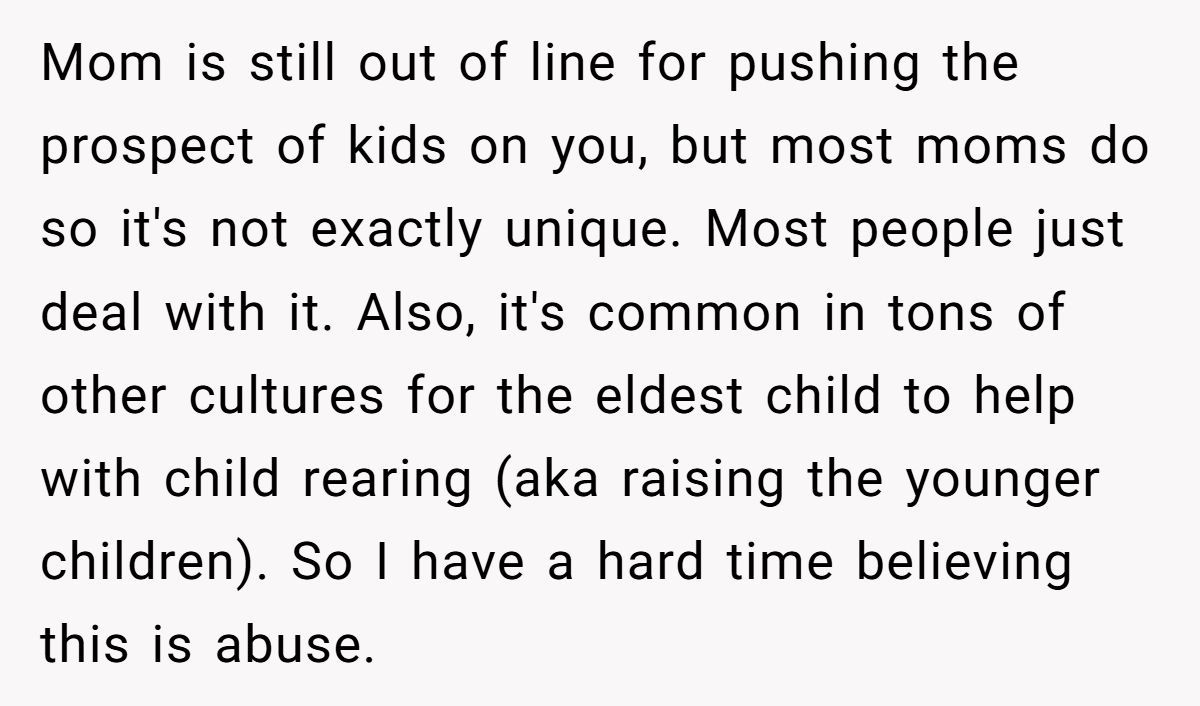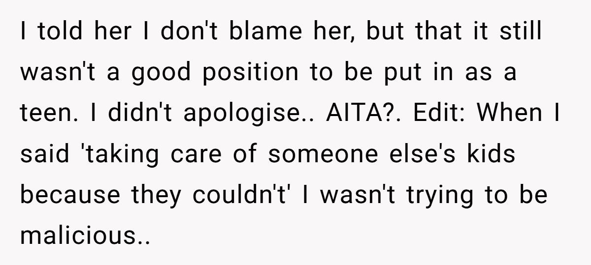 Still, the Redditor’s word choice stung. Calling her siblings “someone else’s kids” felt cold, even if she meant it as a reflection of her role, not a rejection of family. Both sides have merit: the mom’s desperation and the daughter’s lost adolescence.