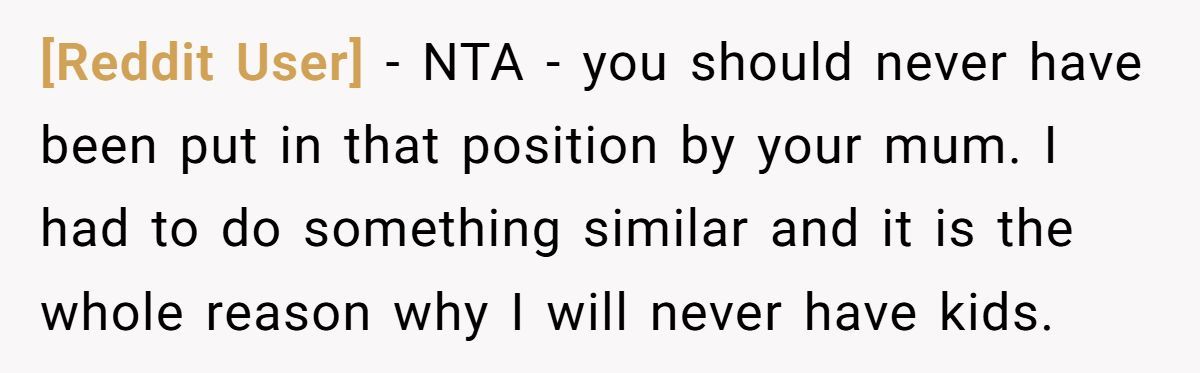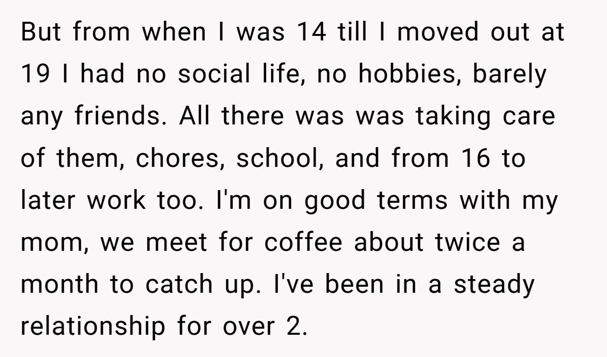 Let’s unpack this. The Redditor’s feelings are valid: she was thrust into parentification, a term psychologists use when kids take on adult roles too soon. It’s not just chores, it’s the emotional weight of raising siblings while you’re still figuring out algebra.
