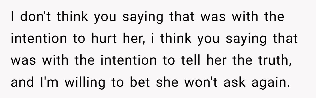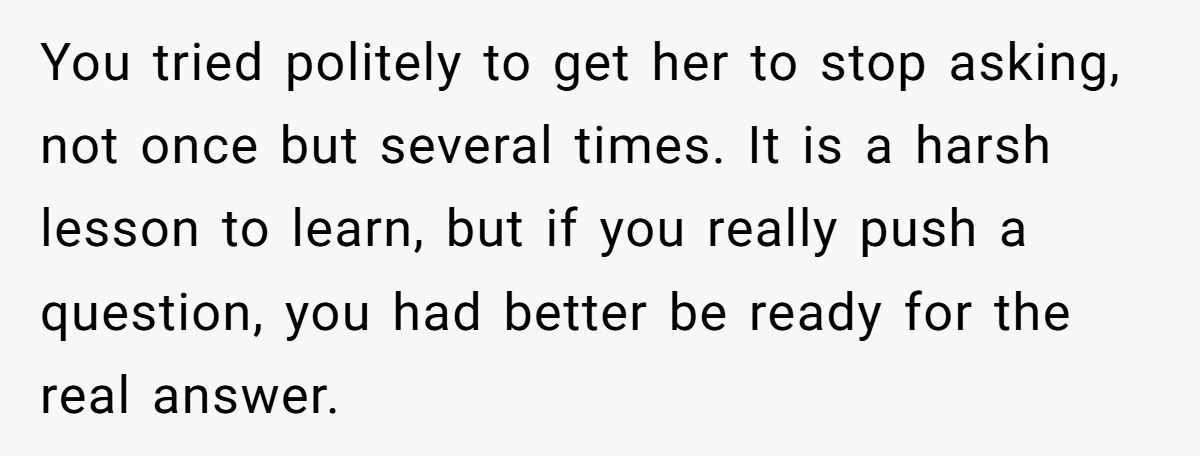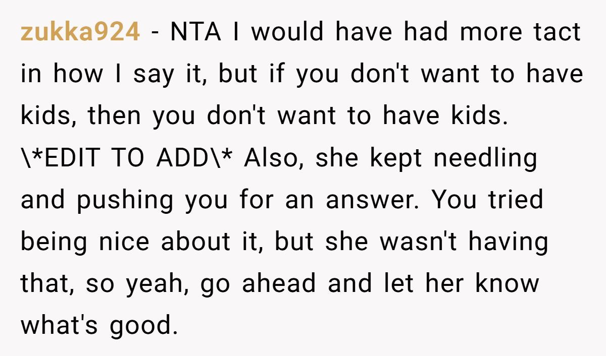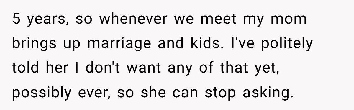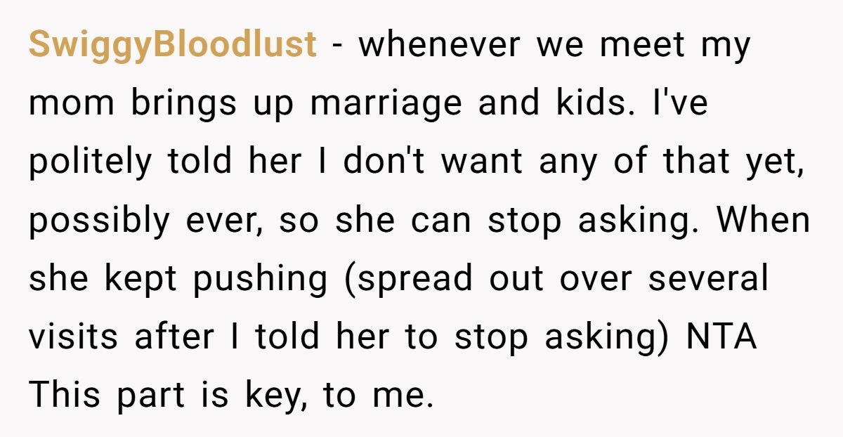 Was her bluntness a fair shot, given her mom’s relentless nudging, or did it cut too deep? Could a gentler chat mend their rift, or is this a boundary worth holding firm?