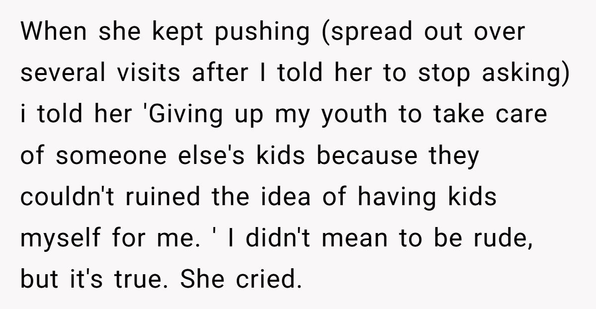 When the topic of kids came up, the Redditor’s blunt honesty, calling her siblings “someone else’s kids,” hit like a plot twist, leaving her mom in tears.
