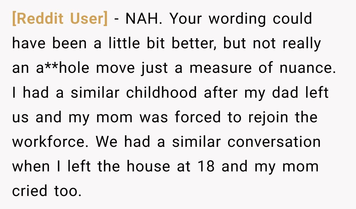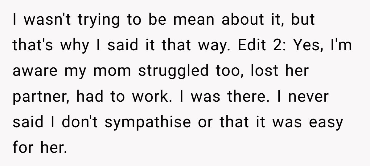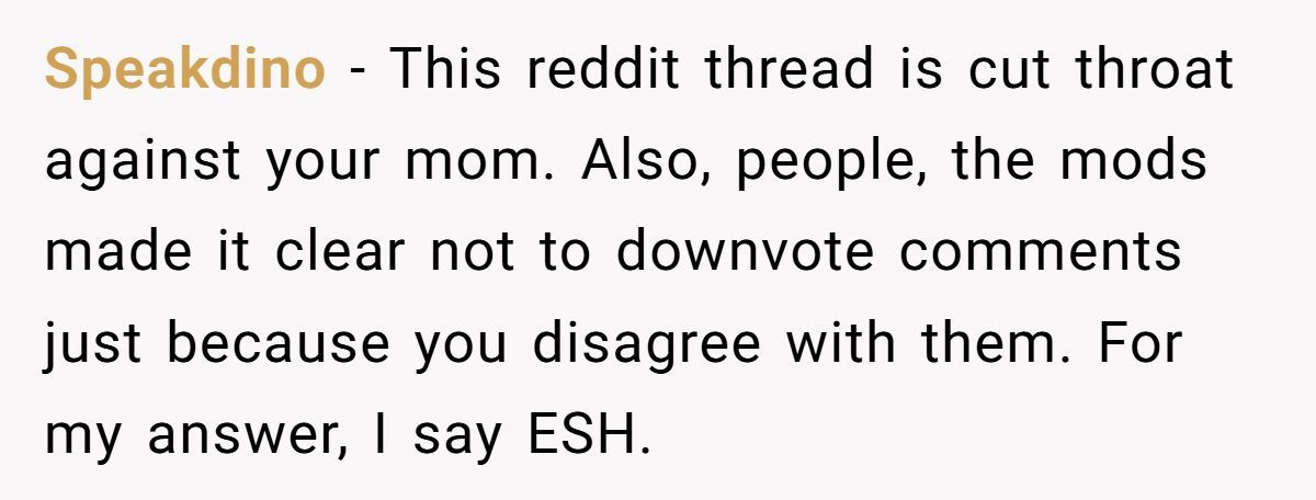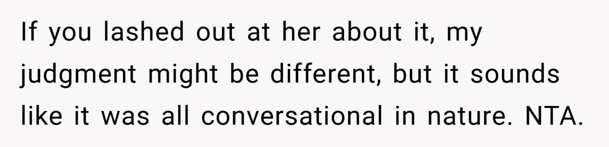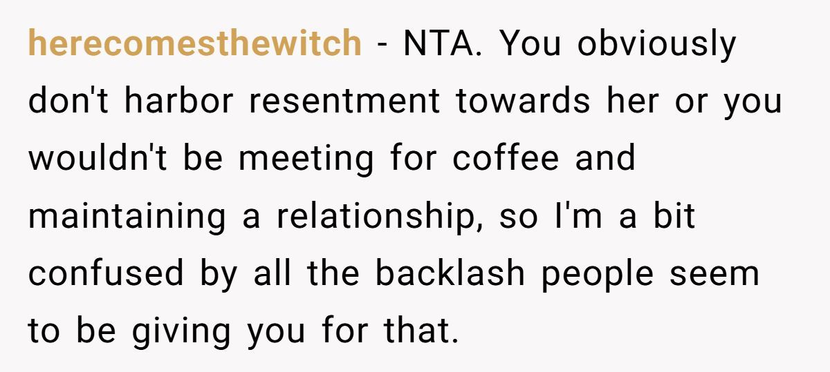 A softer delivery might have opened a dialogue, not a wound. Moving forward, they could try a heart-to-heart, maybe over another latte, where the Redditor shares her boundaries kindly, and Mom listens without pushing.