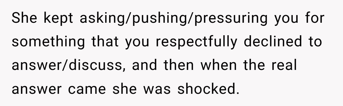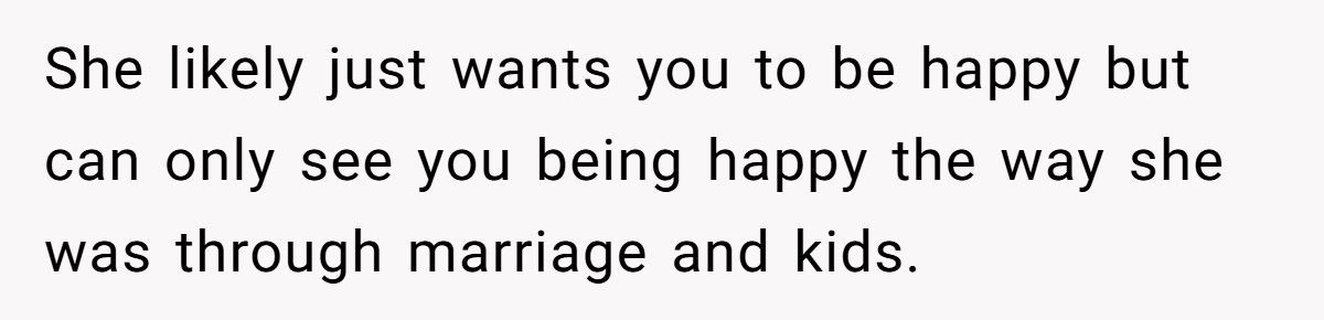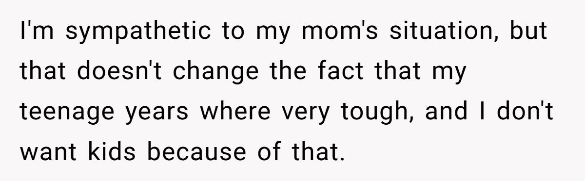 A 2021 study in the Journal of Family Psychology found that parentified kids often face burnout, anxiety, and, yes, reluctance to start families of their own. Sound familiar? The Redditor’s choice to go child-free stems from this, and her frustration at her mom’s prodding is understandable. She tried setting boundaries politely, but Mom kept poking the bear.