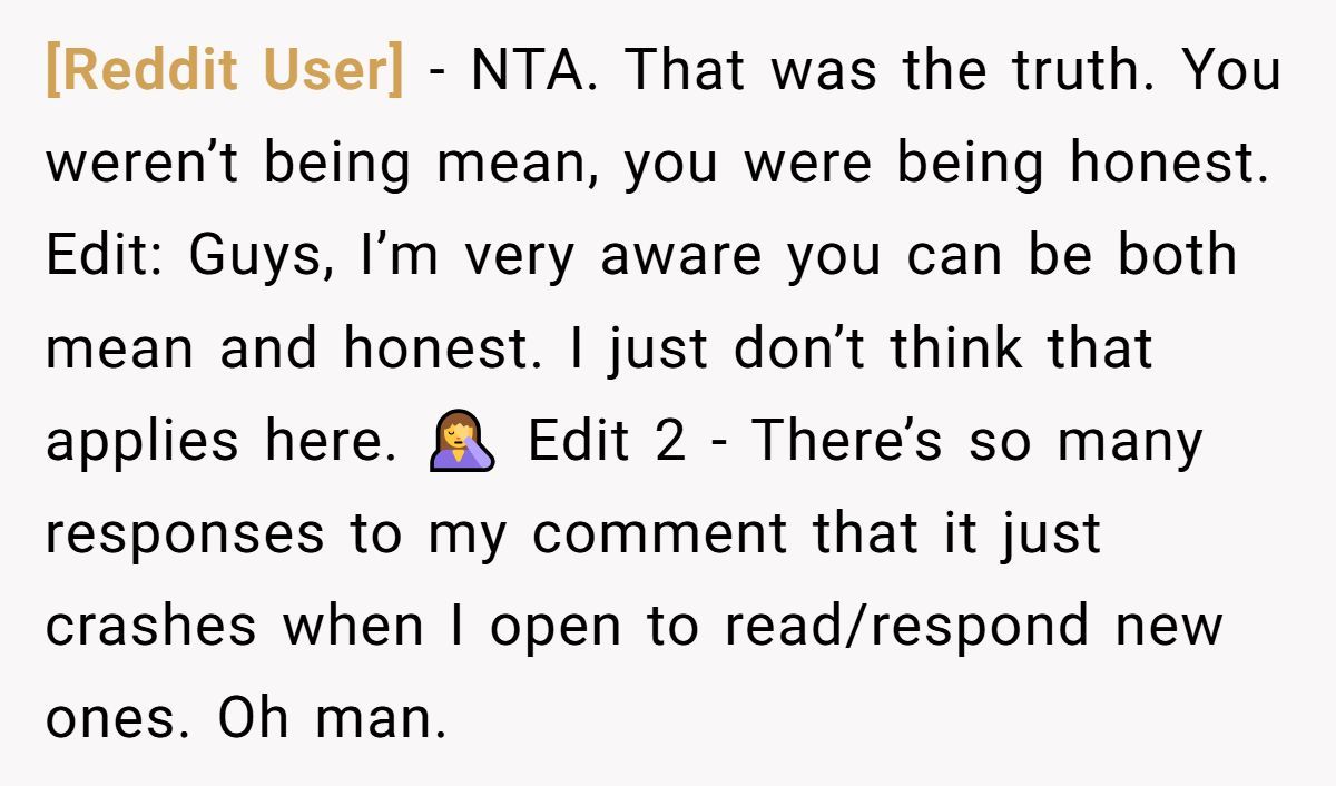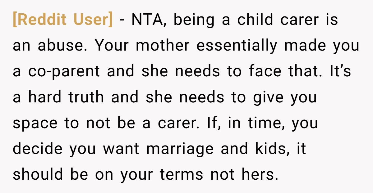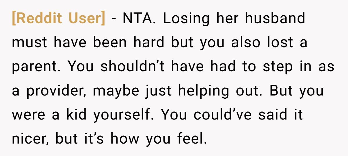 Commenters agreed OP wasn’t the AH. They felt OP was honest, not mean, and said being forced into a caregiver role as a kid was unfair.