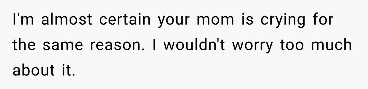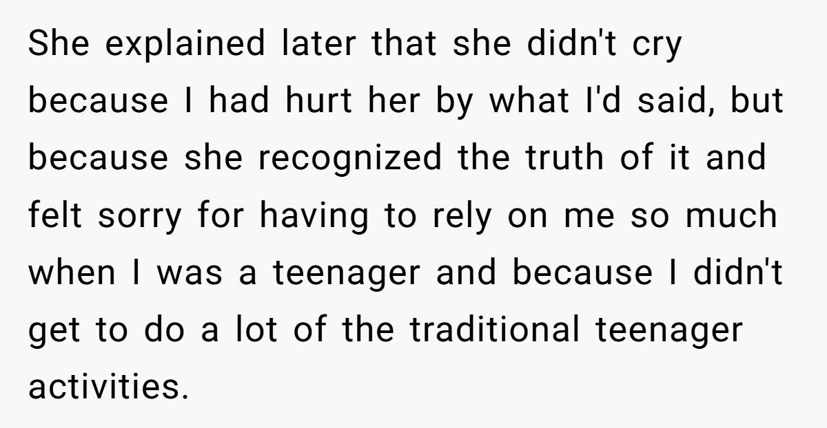Dr. Lisa Damour, a clinical psychologist, notes in a New York Times article, “Parents under stress may rely on older children, but it’s a balance. Supporting the family shouldn’t erase the child’s own needs.” The mom’s tears suggest guilt, not just hurt, recognizing her daughter’s sacrifice.
